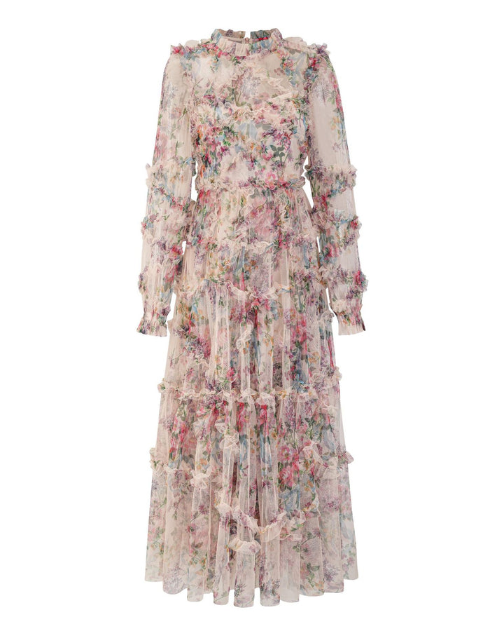 Bishop Sleeve Floral Tulle Ruffle Dress