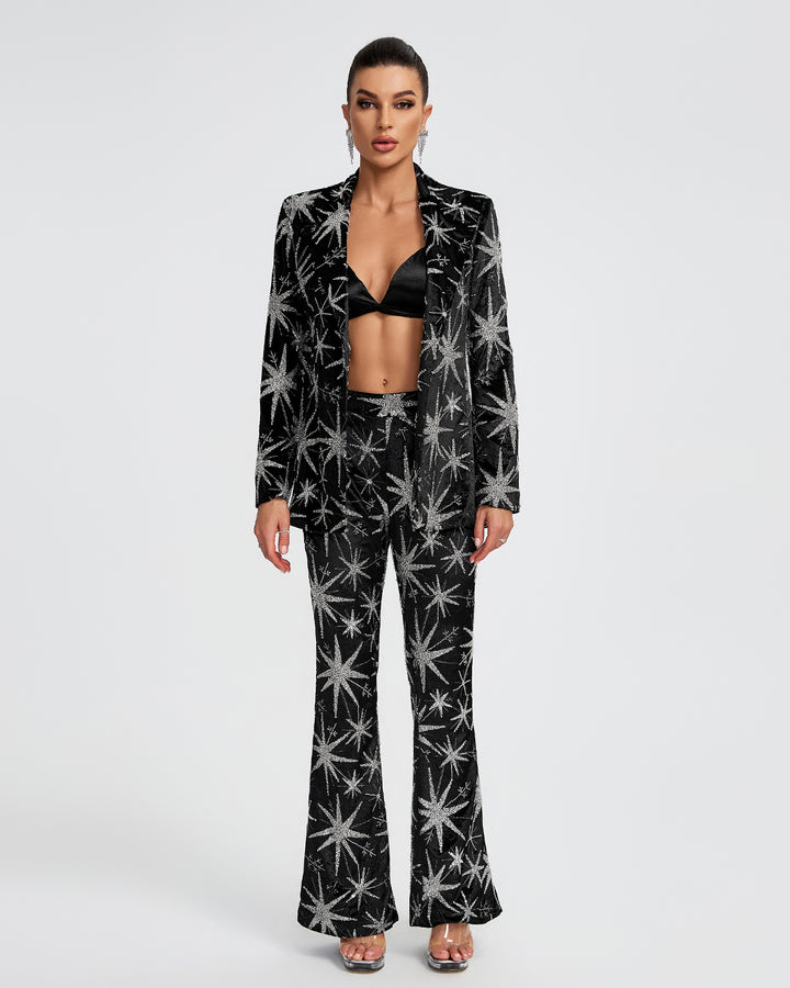 Sparkle and shine in our Velvet Stella Star Blazer 2-Piece Set. This set includes a velvet blazer and matching pants. Stand out from the crowd with this unique and stylish ensemble, perfect for a night out or special occasion.