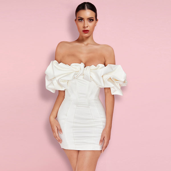 Off Shoulder Short Sleeve Frill Mini Bodycon Dress