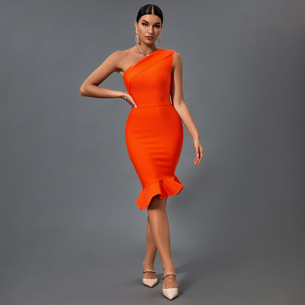 One Shoulder Sleeveless Frill Over Knee Bandage Dress PM1205