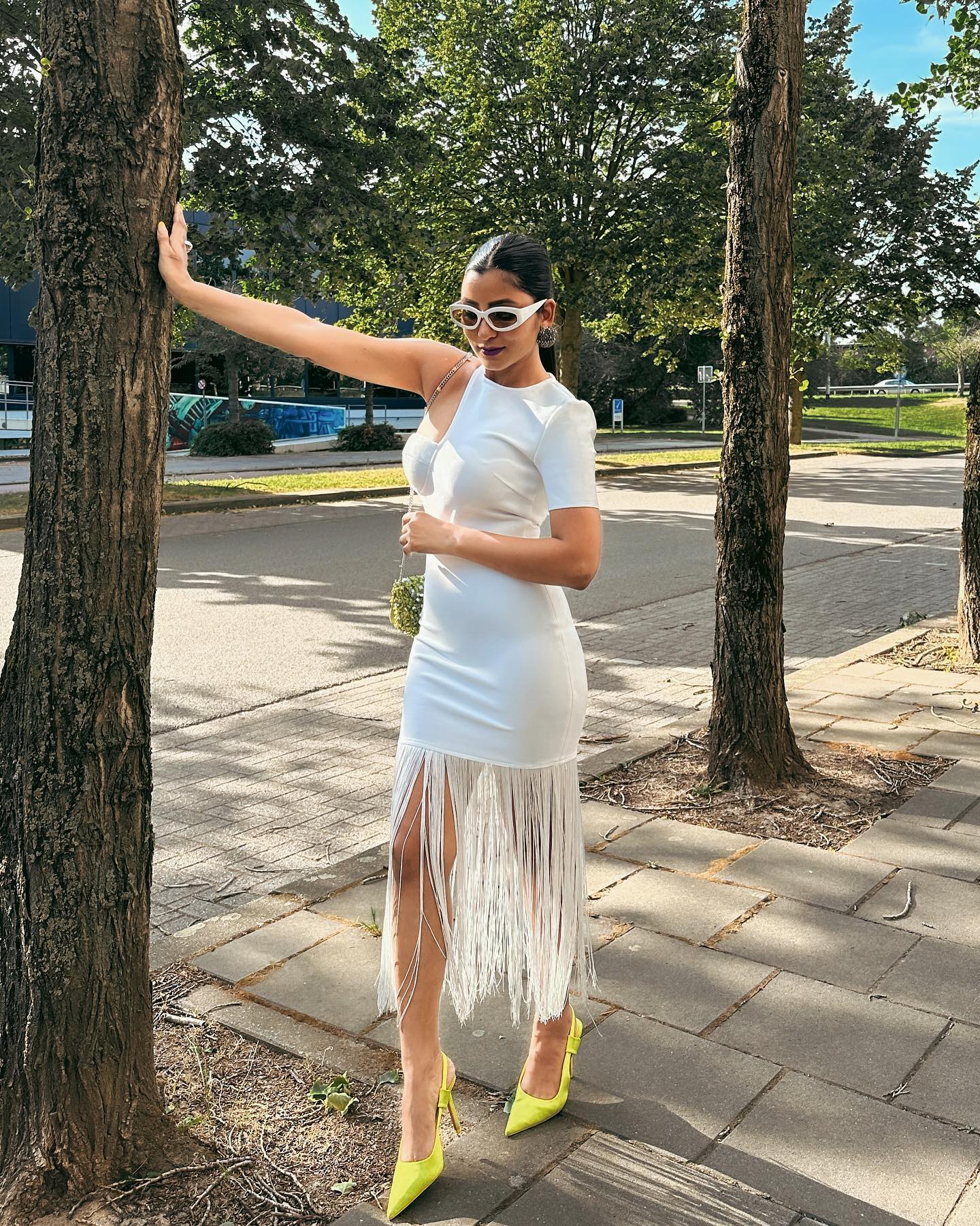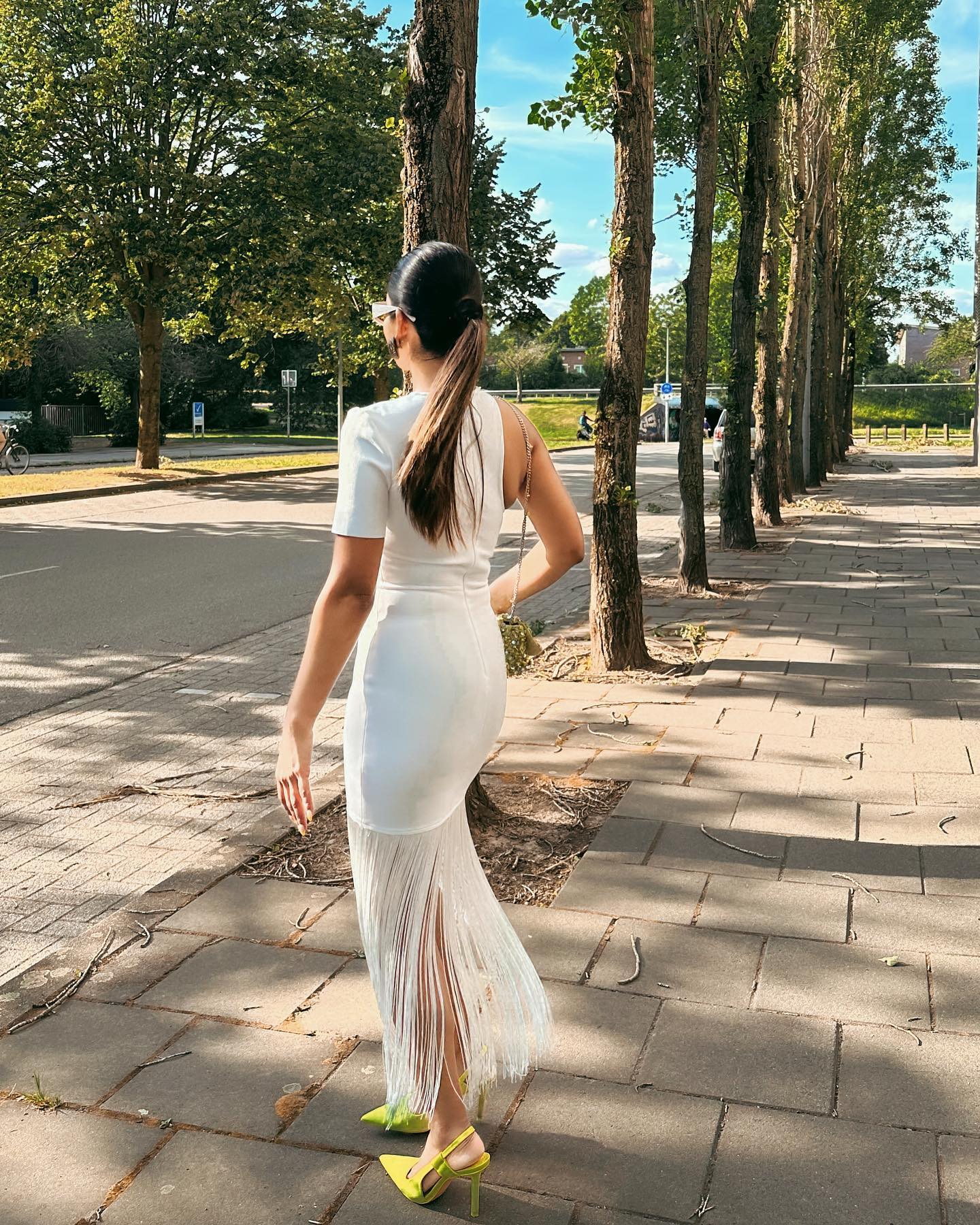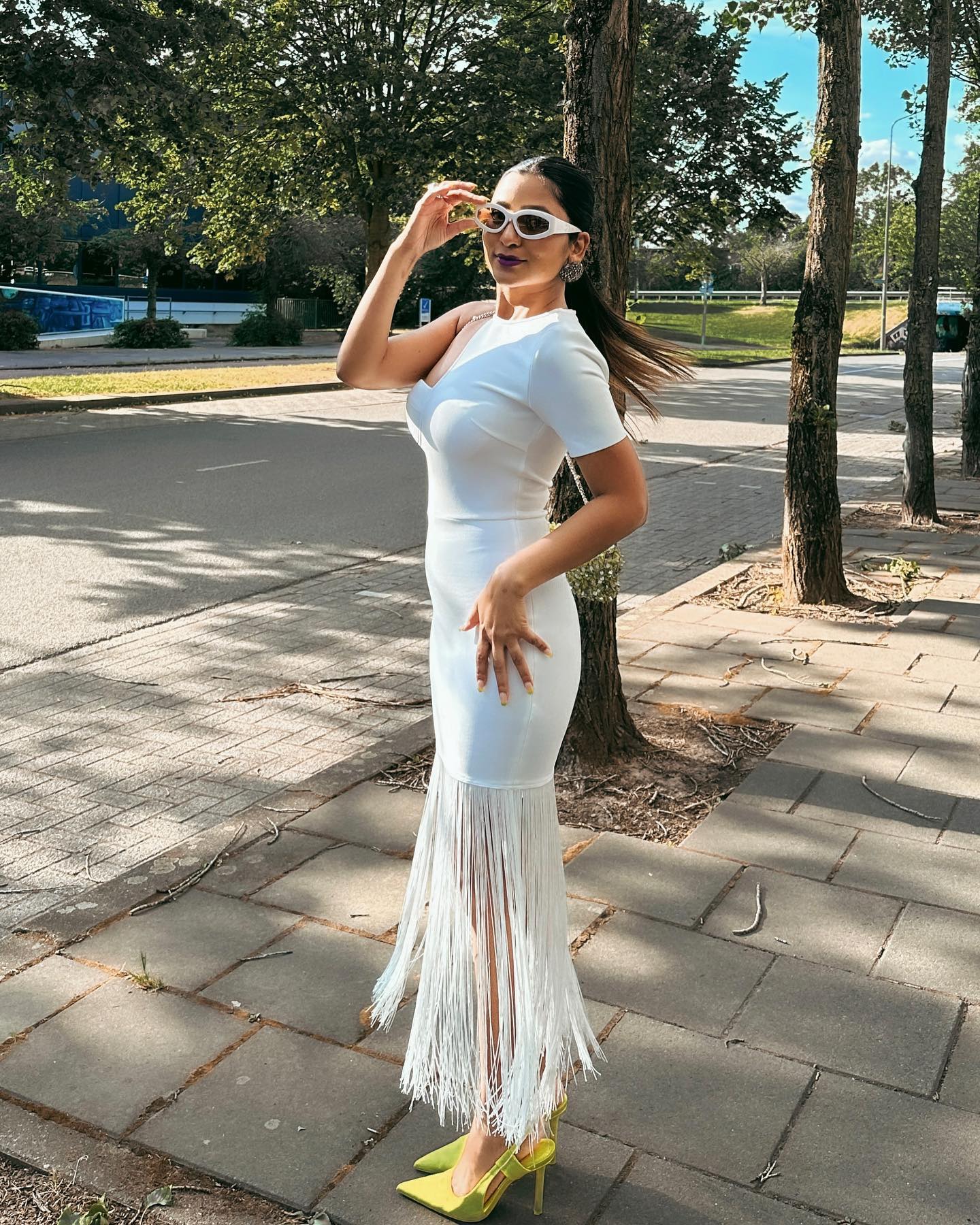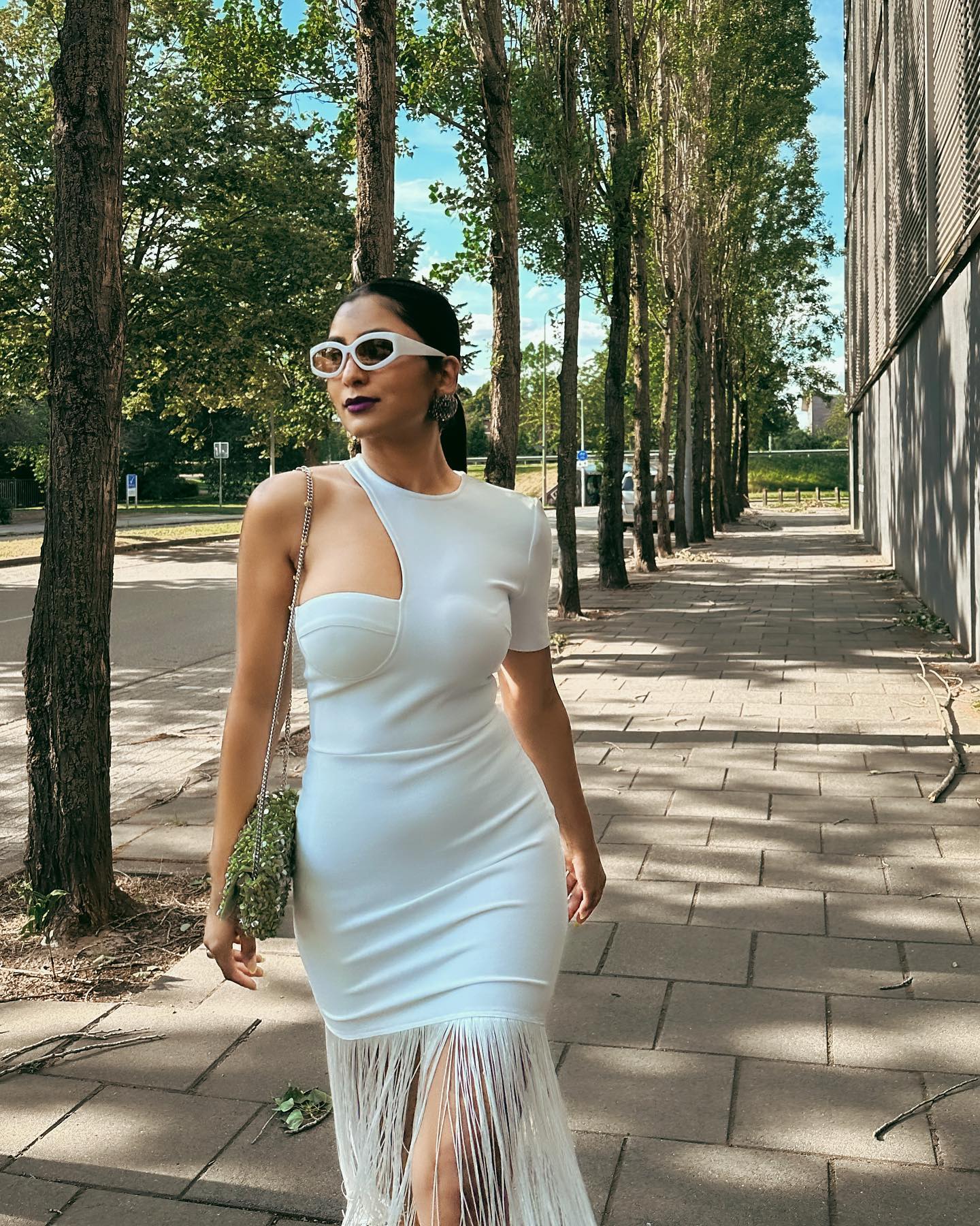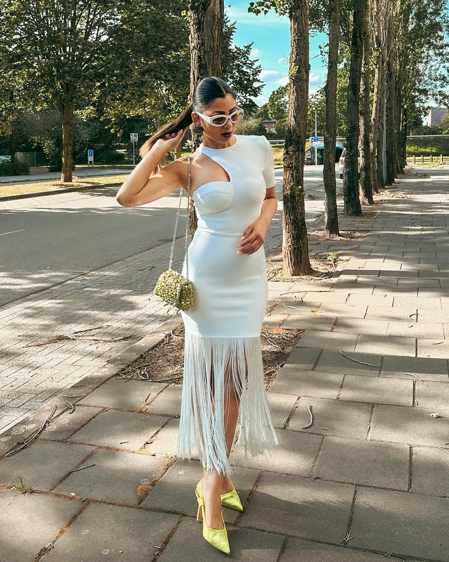 Introducing the Asymmetric Tassels Maxi Bandage Dress, the perfect embodiment of luxurious style and timeless elegance. Featuring a beautiful asymmetrical tassel silhouette crafted from premium bandage fabric, this dress is sure to make you feel like a red-carpet star. With its intricate detailing and exquisite craftsmanship, you can be sure of a truly special look that will make heads turn.