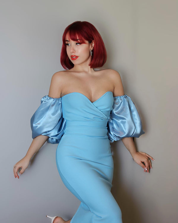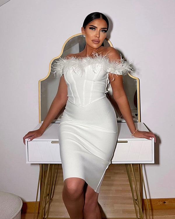 Off Shoulder Puff Sleeve Frill Midi Bandage Dress