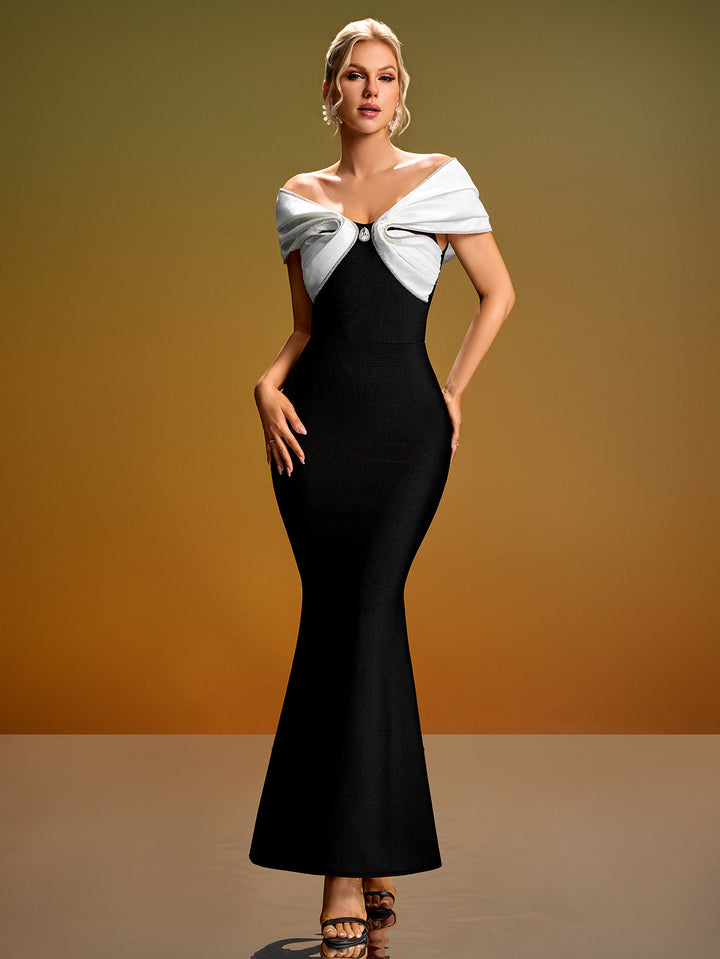 This off shoulder crystal embellished mermaid gown adds elegance with its gentle curve and glittering crystal details. A perfect choice for formal events and classic evening styles.