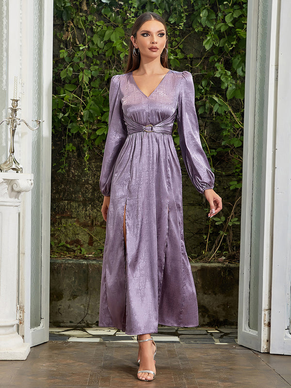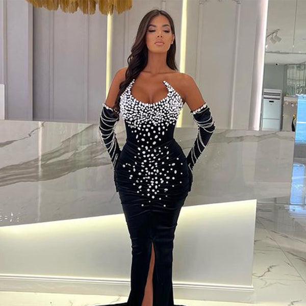 Crystal Embellished Puff Sleeve Fishtail Dress