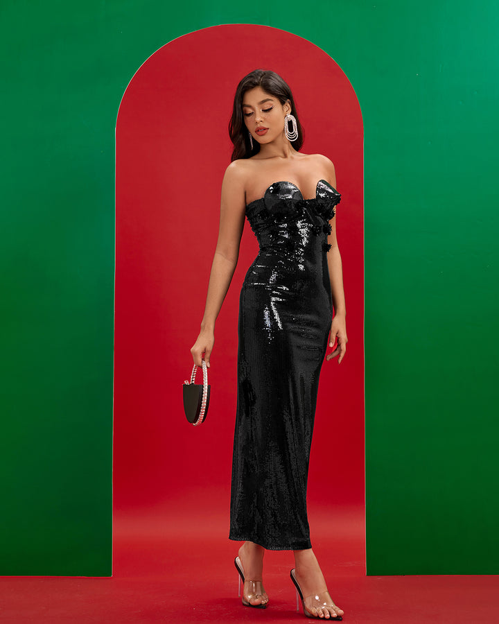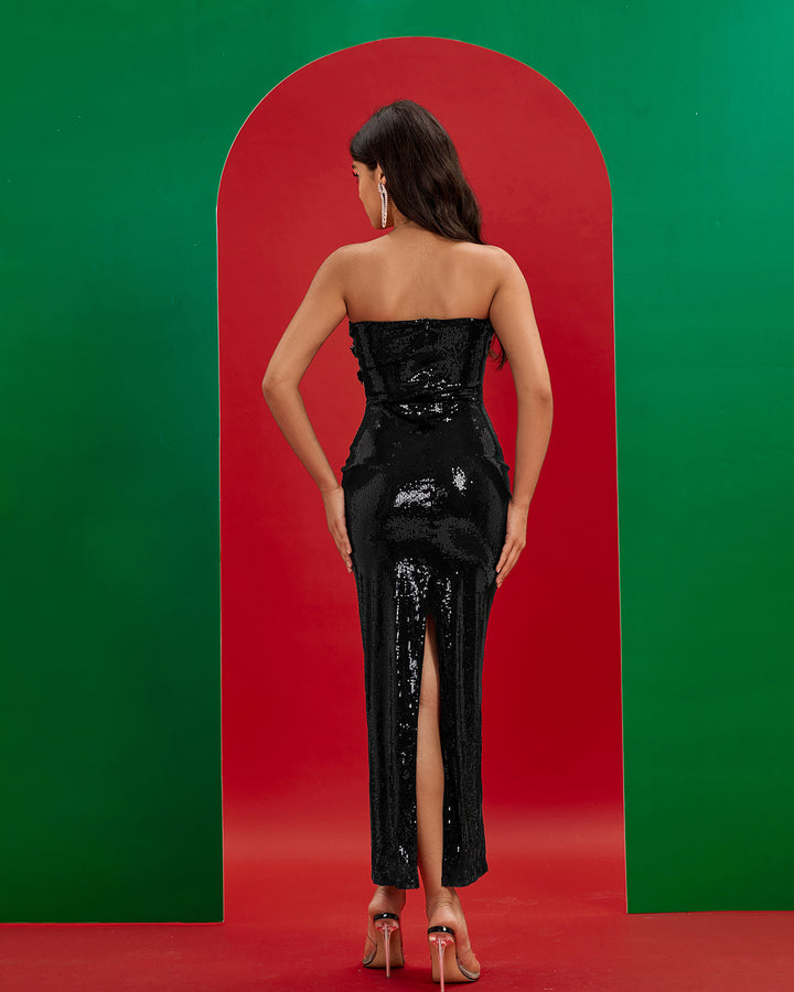 Achieve a memorable look with this elegant Strapless Maxi Sequins Dress. Cut for a flattering fit, the strapless silhouette, and bold, shimmering sequins will make you the center of attention at any event. With timeless style, this luxurious dress elevates your look to the next level.