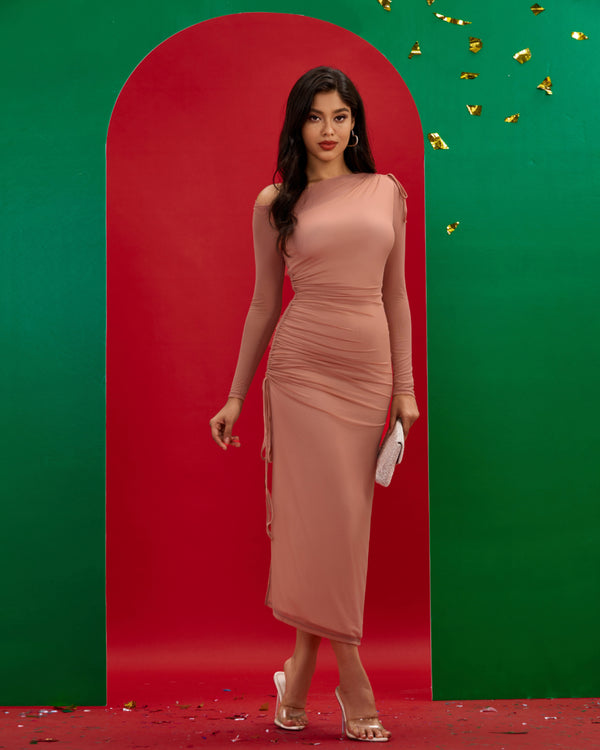Slanted Shoulder Lace Ruched Maxi Dress