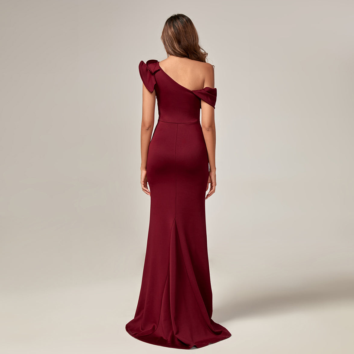 Our Asymmetrical Neck Ruffle Trim Prom Dress features an elegant design with an asymmetrical neckline and ruffle trim for a classic, sophisticated look. Perfect for formal events, this dress will make you shine.