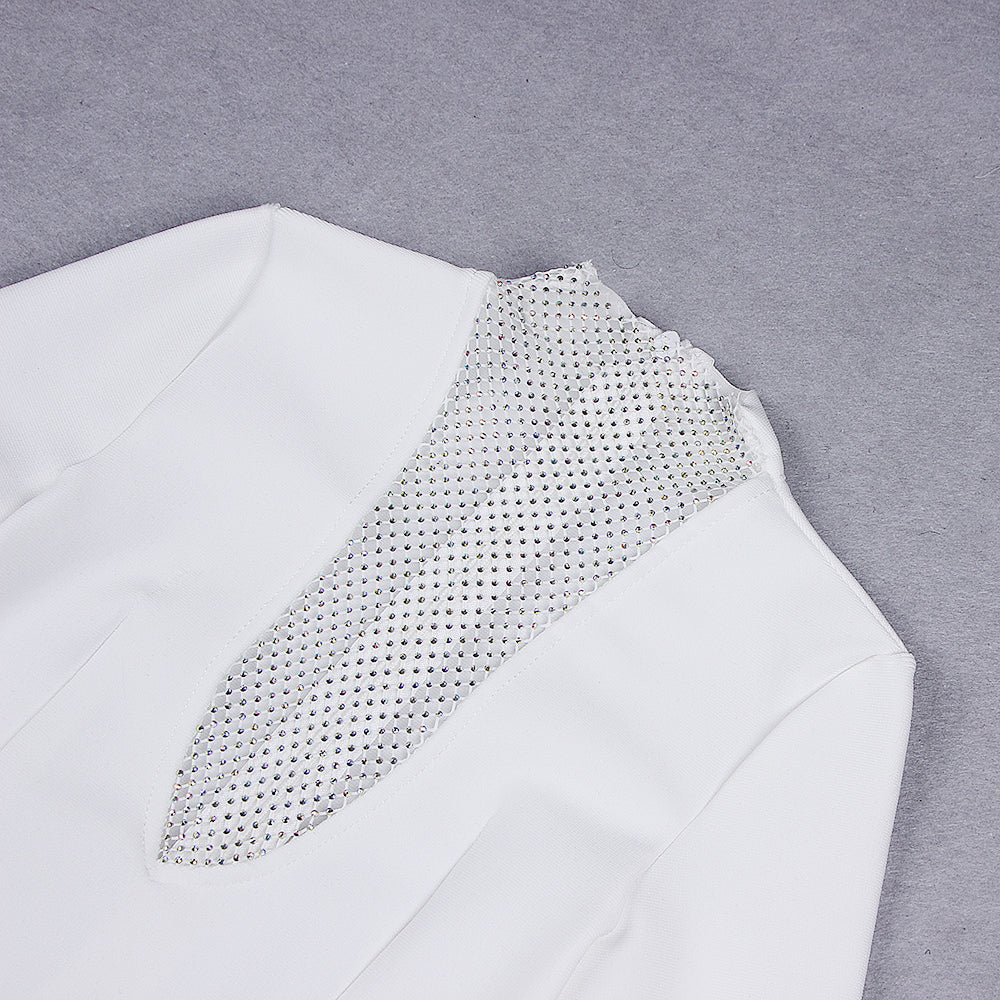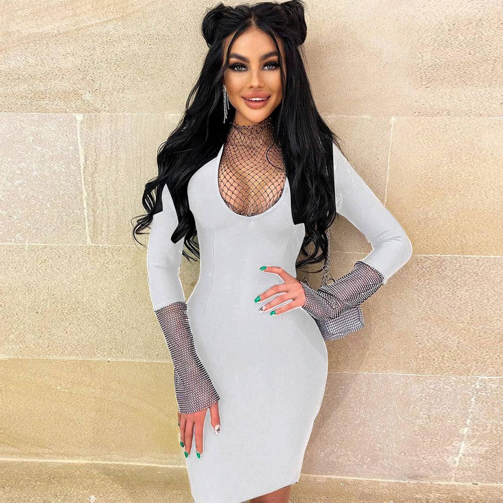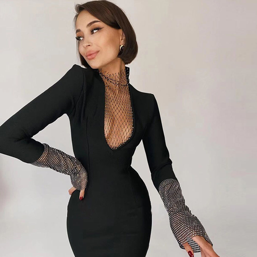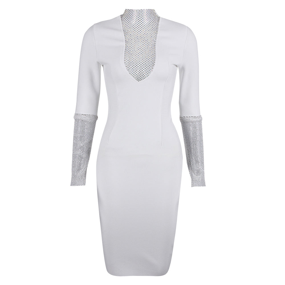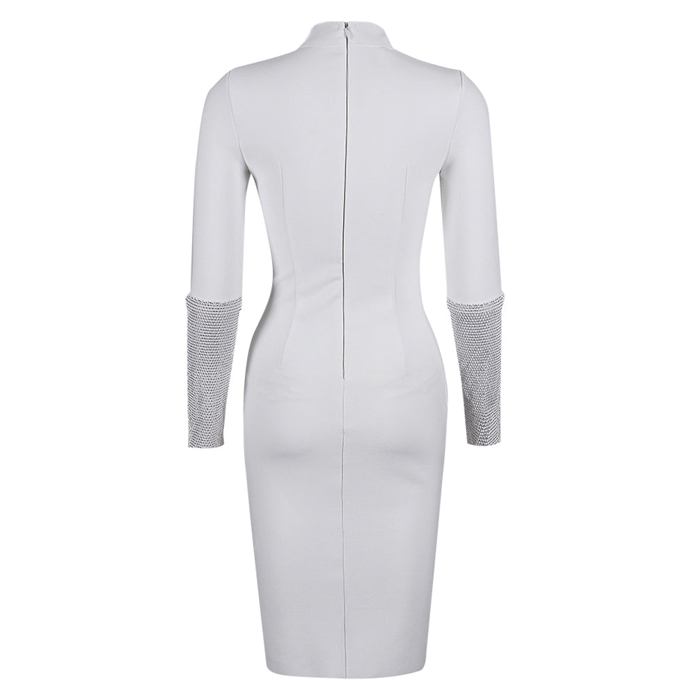 High Neck Long Sleeve Rhinestone Midi Bandage Dress