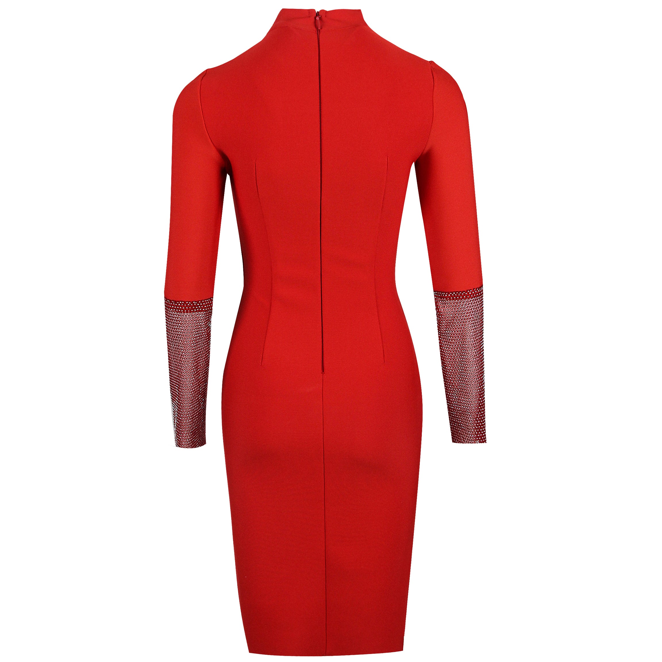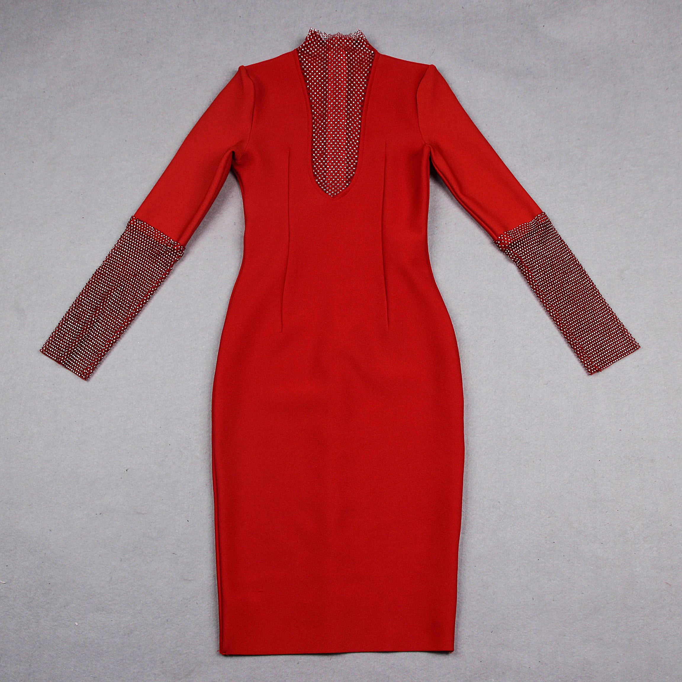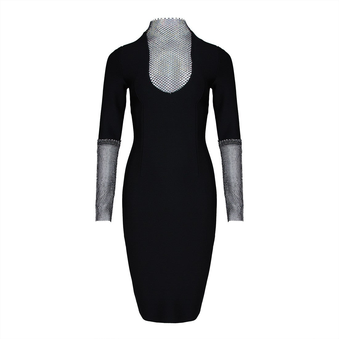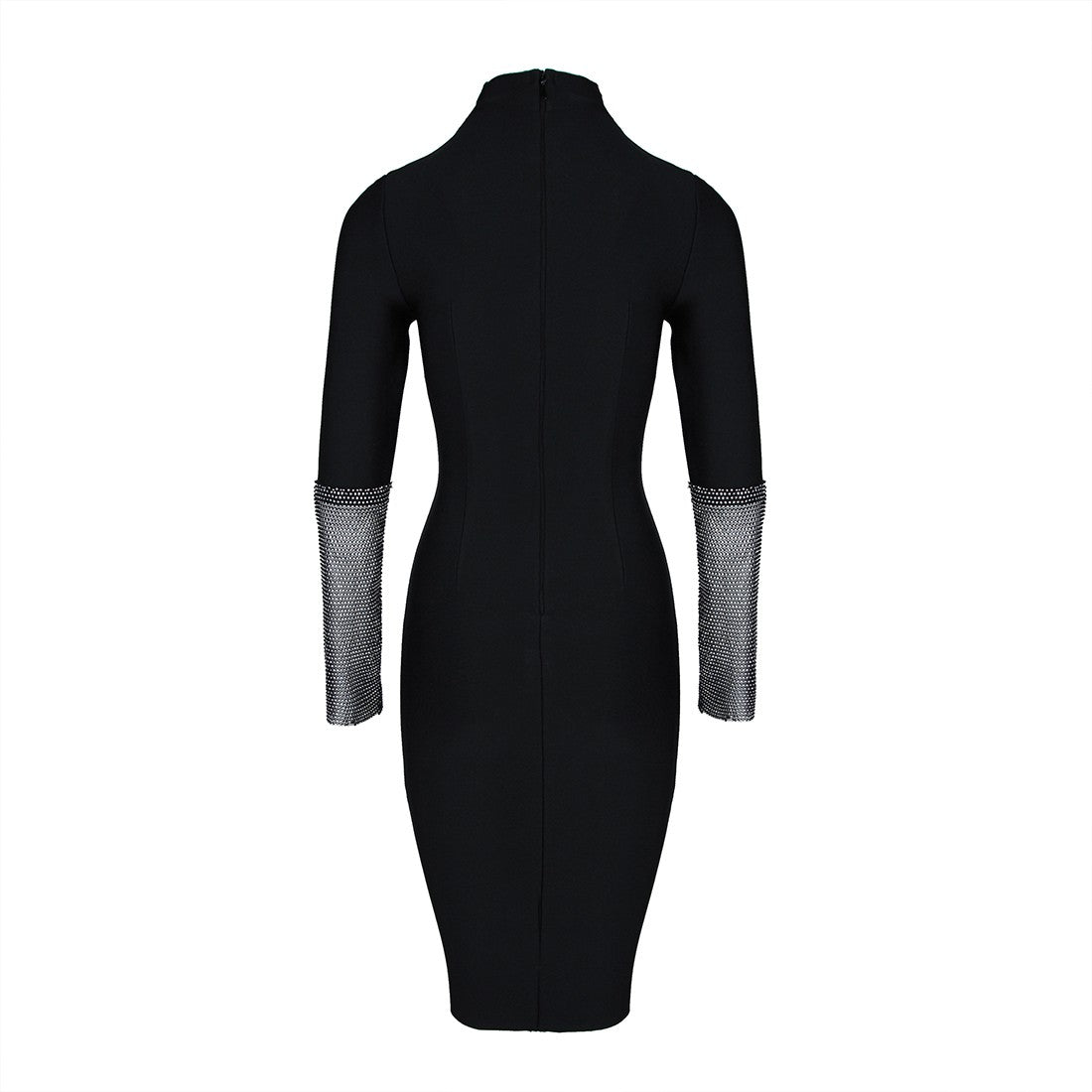 High Neck Long Sleeve Rhinestone Midi Bandage Dress