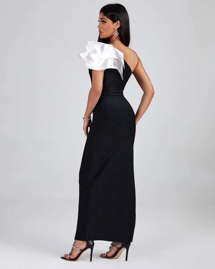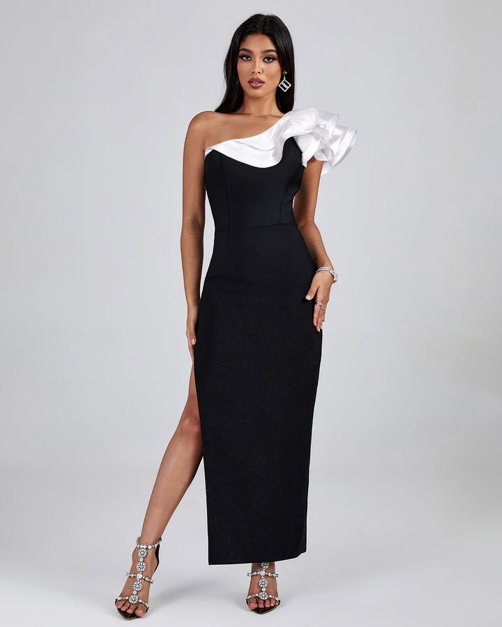 Our Irregular Ruffled Side Slit Bandage Dress exudes timeless elegance and luxury. Crafted with intricate detail, the delicate ruffle pattern drapes elegantly over the body, while the side slit adds a hint of sophistication. Step out in style in this luxurious, exclusive dress that will make you feel like a fashion icon.