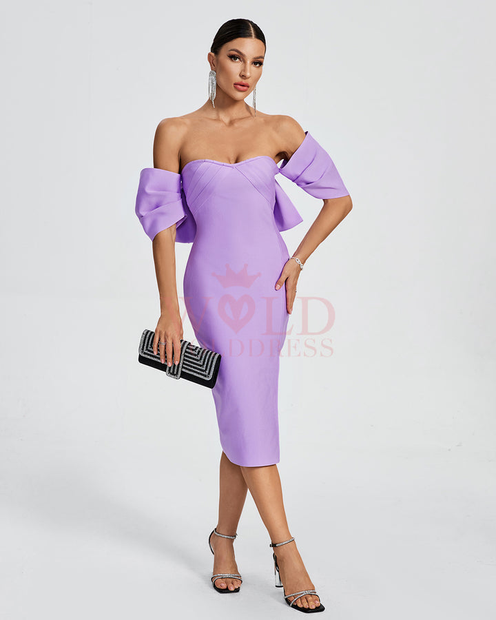 Be the center of attention in our Off Shoulder Bow-Detail Midi Bandage Dress. The vibrant purple color and tasteful side slit will have all eyes on you. The off shoulder neckline with bow detail adds a touch of feminine charm. Perfect for making a statement at any event.