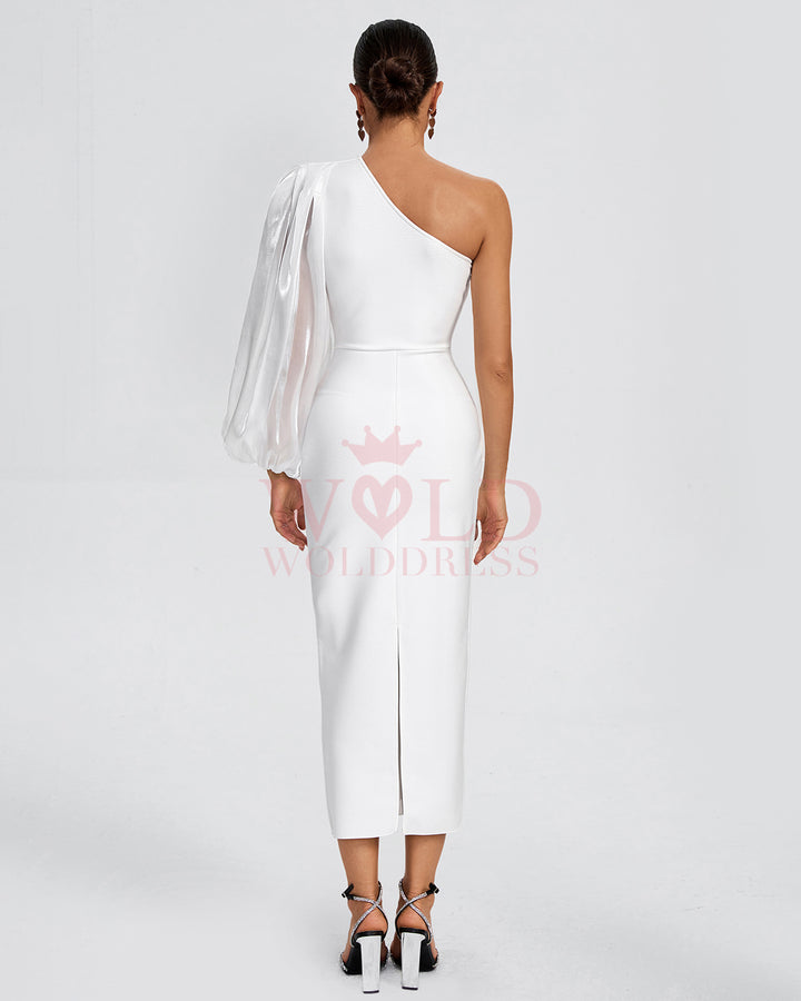 Introducing our One Shoulder Bishop Sleeve Bandage Dress. This stunning pure white dress exudes sensuality and elegance. Its one shoulder design and bishop sleeves add a touch of sophistication, making it the perfect choice for any special occasion. Elevate your style with this luxurious and exclusive dress.