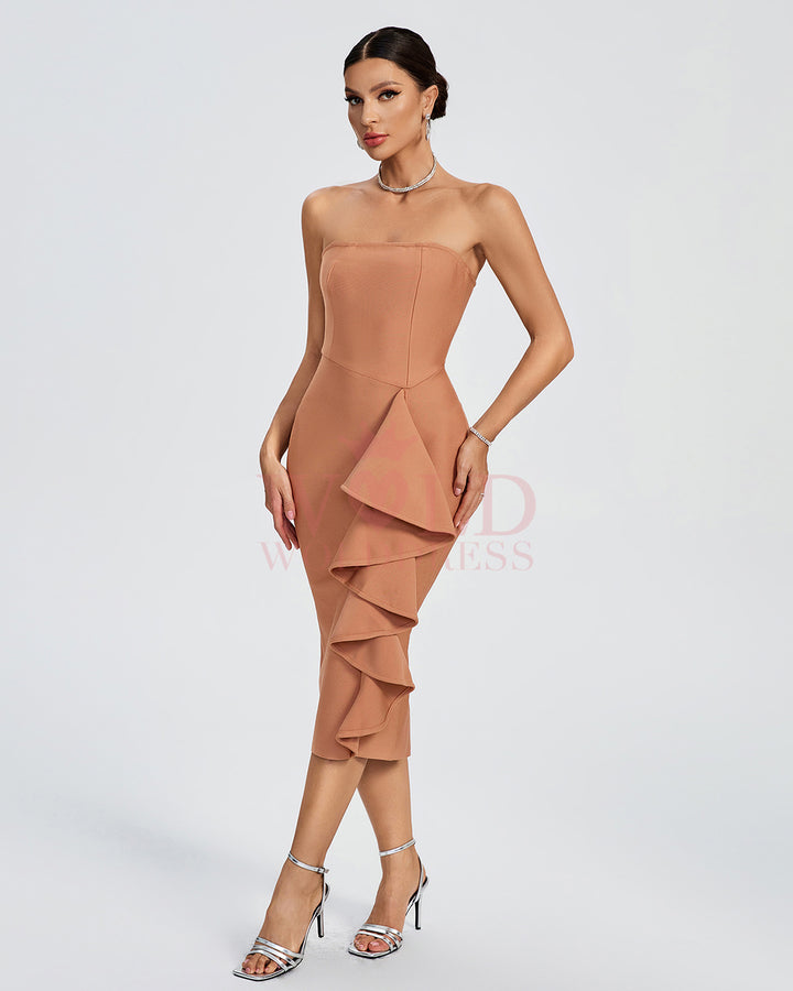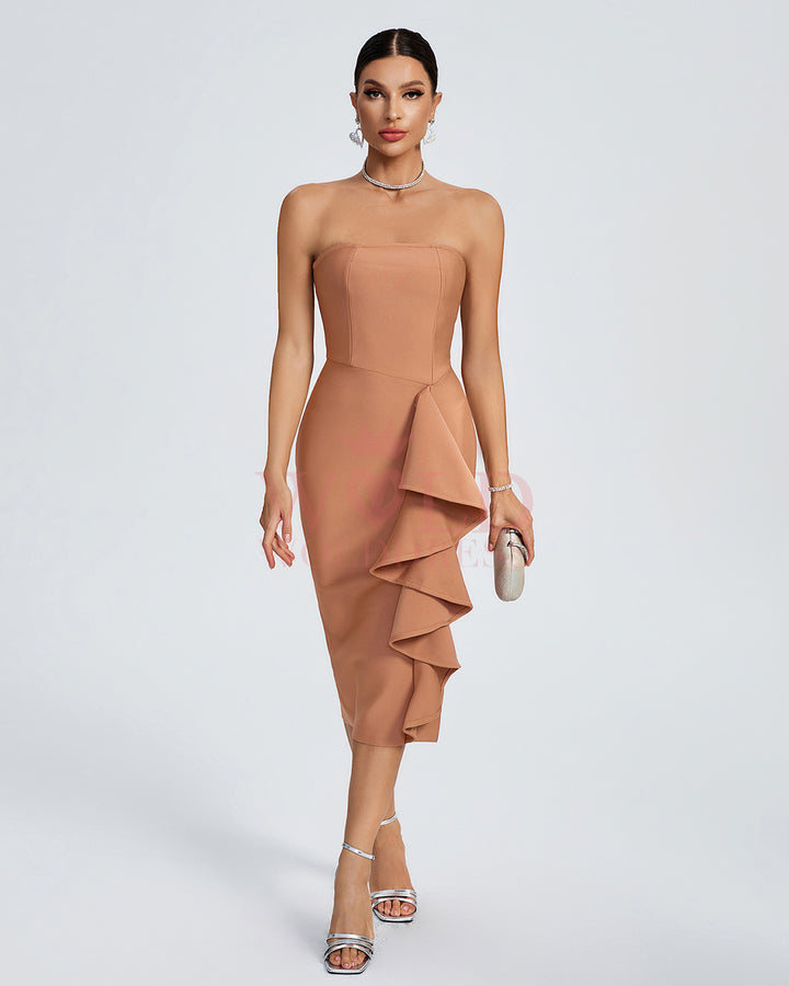 Indulge in luxury and elegance with our Strapless Ruffle Bandage Midi Dress. Featuring a delicate strapless design and flattering ruffle detailing, this dress is designed to make you feel confident and classy. The rich brown color adds a touch of sophistication, making it the perfect choice for any occasion.