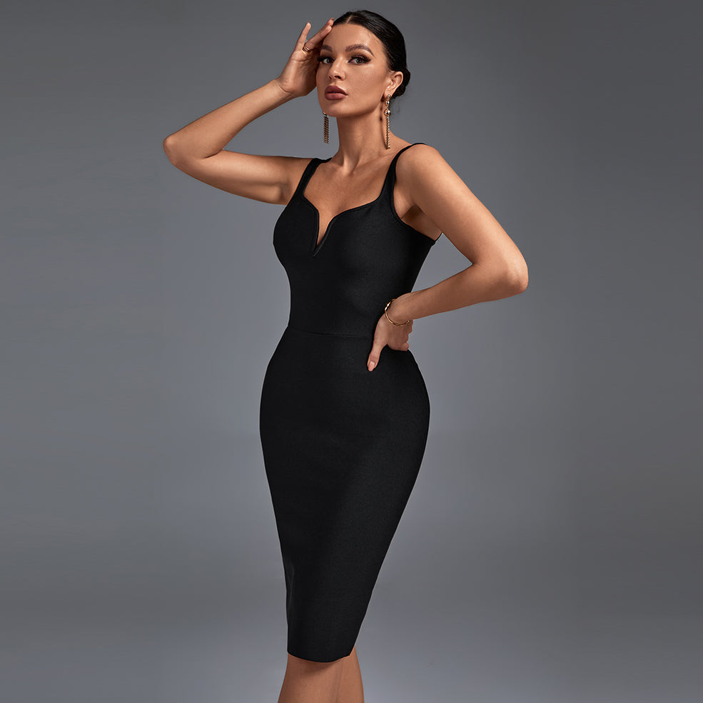 Elevate your wardrobe with this sophisticated midi bandage dress. Crafted with luxurious figure-hugging material, the dress features delicate strappy detailing, a low back, and an elegant midi length. Perfect for a chic and stylish look.