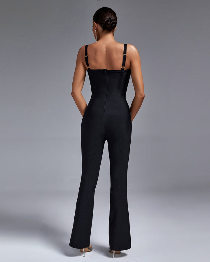 Designed with a sleek stripe pattern, this Strappy Stripe Bandage Jumpsuit is the epitome of sophistication and style. Embellished with elegant straps and crafted from high-quality fabric, this jumpsuit is sure to make heads turn at any exclusive gathering. Crafted to hug the curves of your body, this jumpsuit is perfect for those who want to make a statement.