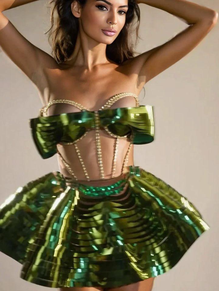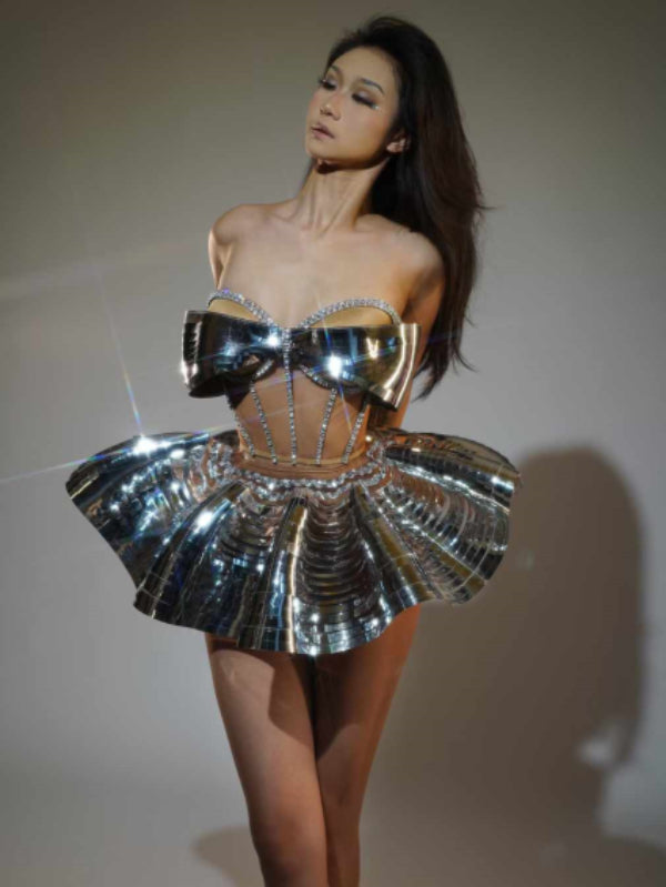 Step into the future with the Wolddress Futuristic Metallic Texture Corset Set. With a structured corset top and shimmering metallic finish it blends innovation with elegance. This unique style is perfect for womens dresses collections looking for statement pieces beyond the ordinary.