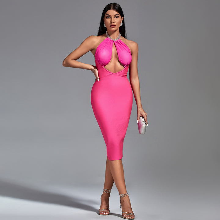 Look stylish and chic with this Drill Chain Halter Backless Bandage Dress! This dress has a drill chain halter neckline with a backless design for a truly flattering look. Made from comfortable bandage materials, this dress is sure to turn heads.