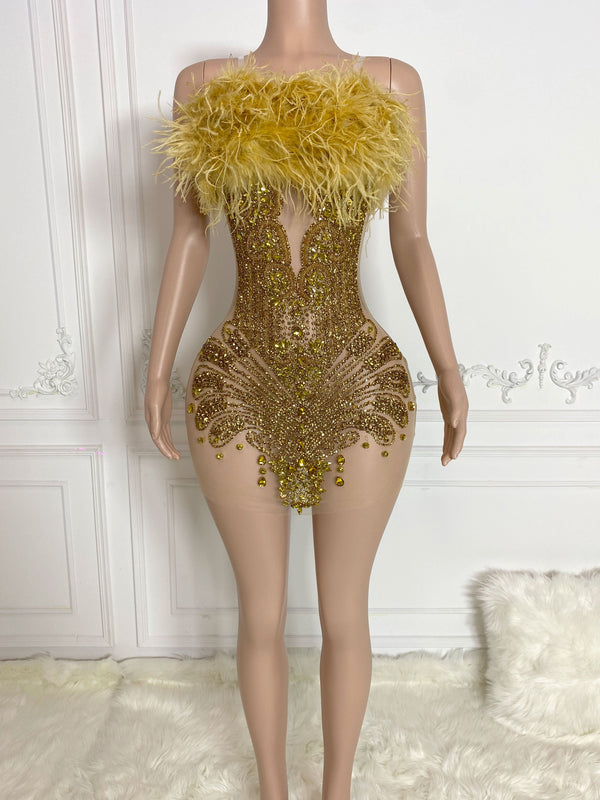 Gold Fur and Rhinestone Embellished Sleeveless Mini Dress