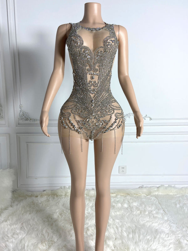 Silver See Through and Big Rhinestone Sleeveless Mini Dress