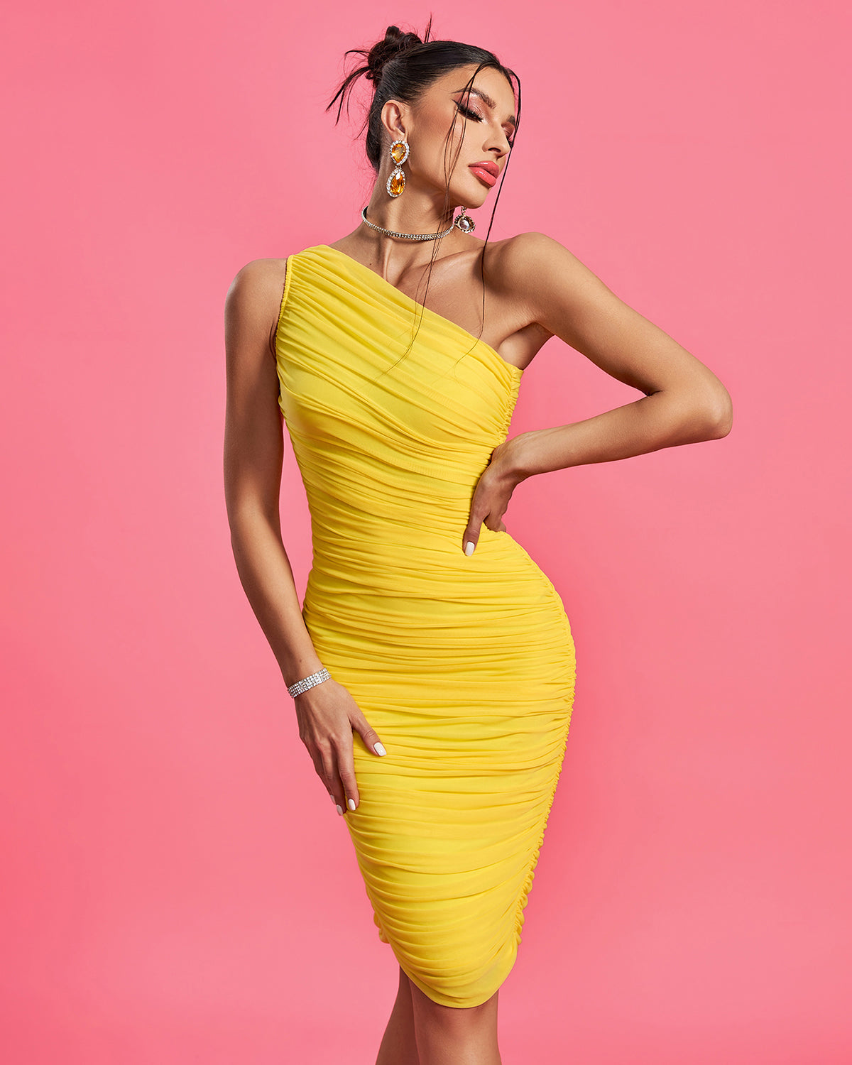 Get ready to turn heads with our One Shoulder Ruched Mesh Dress! This stunning dress features a unique one shoulder design and delicate ruched mesh fabric. Perfect for any special occasion, this dress will make you feel confident and stylish. Don't miss out on this must-have piece for your wardrobe!
