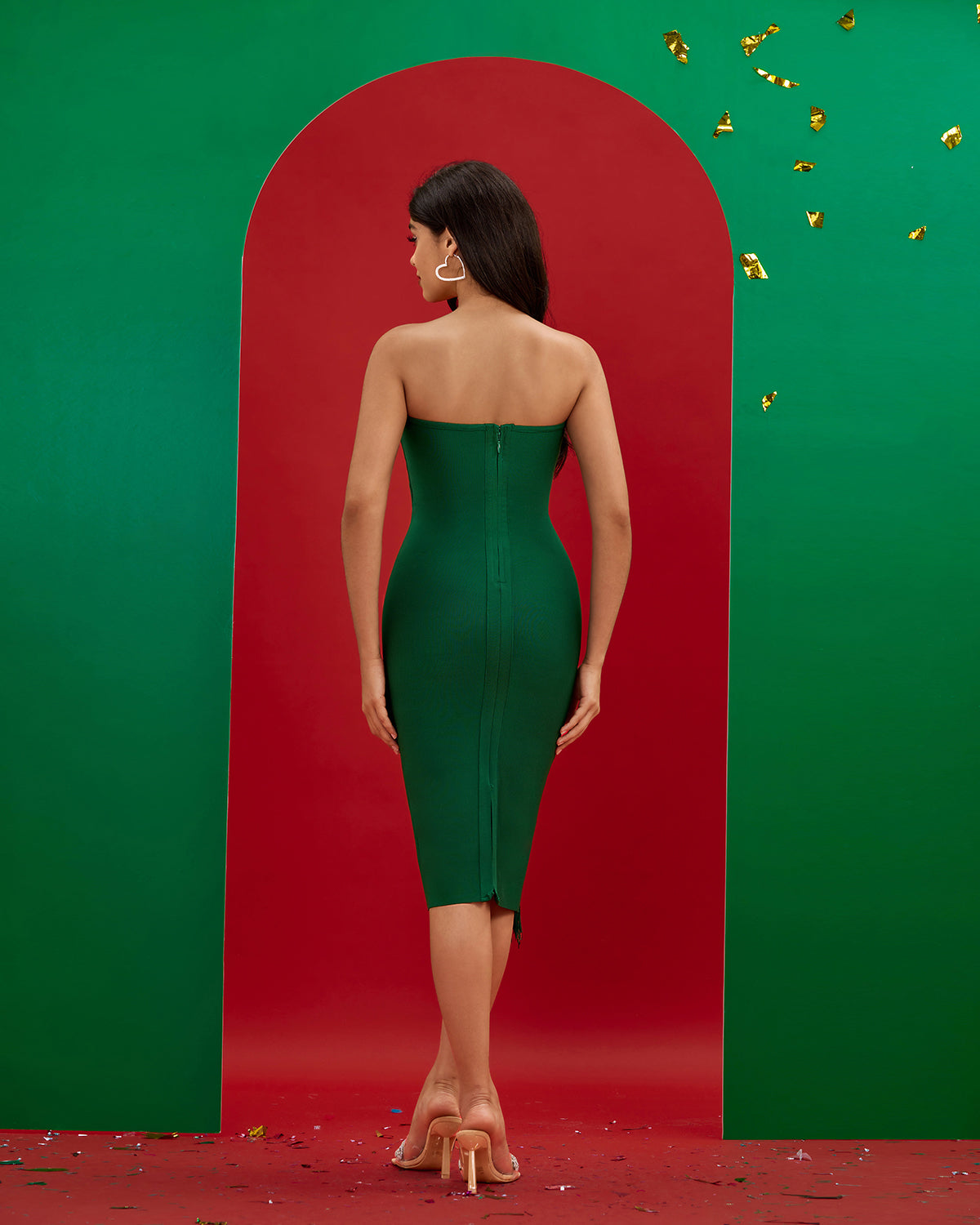 Show off your elegance and sophistication in this stylish Strapless Tassels Midi Bandage Dress. This luxurious midi dress features a tasseled waistline to create a flattering silhouette and a bandage material for comfortable wear. Make a statement at your next special event in this timeless yet modern dress.
