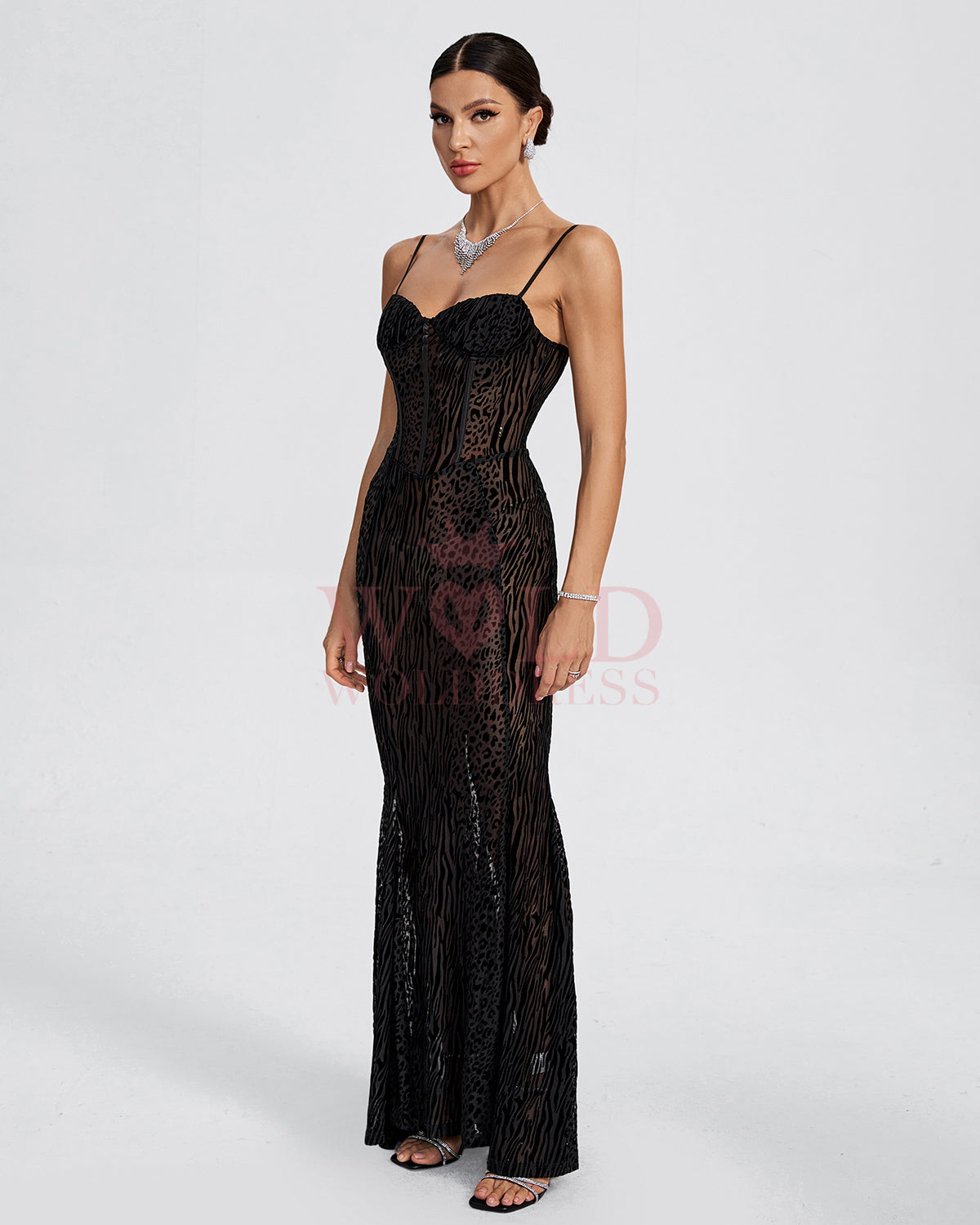 Black Flock Print Detail Mesh Maxi Dress