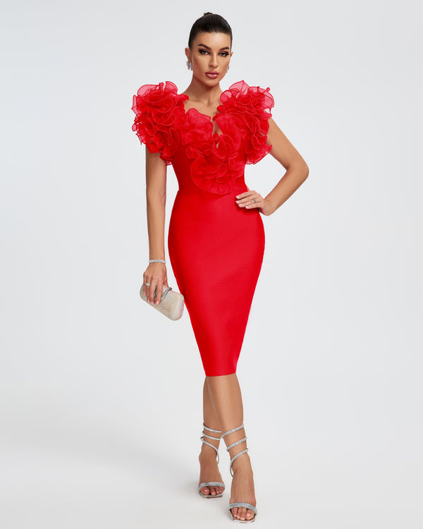 Strappy Puffy Chiffon Trim Midi Bandage Dress