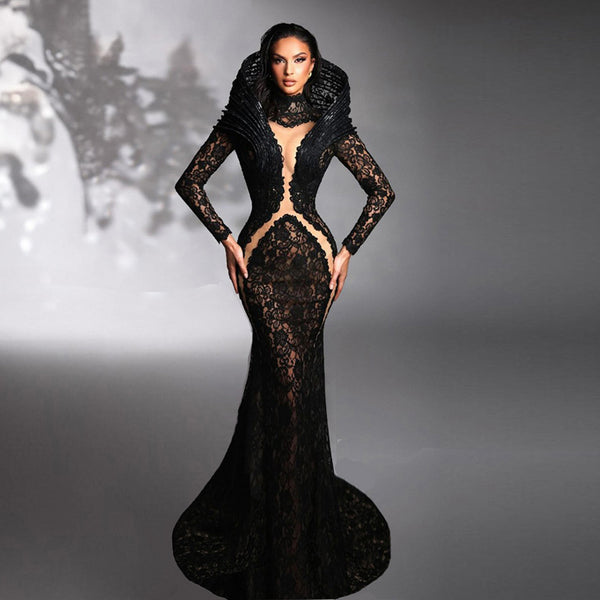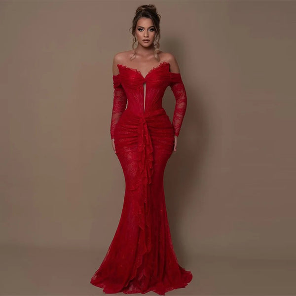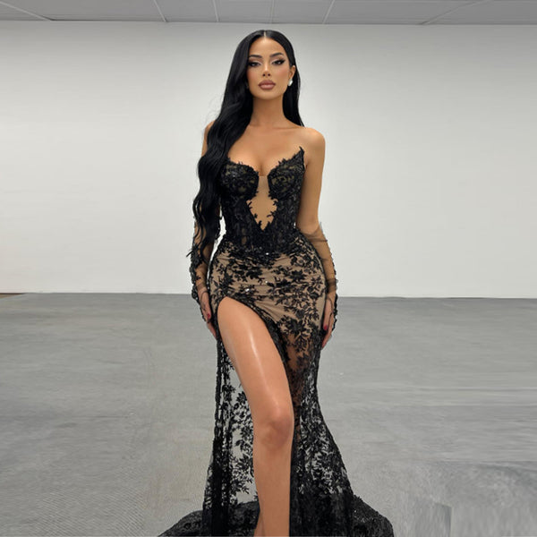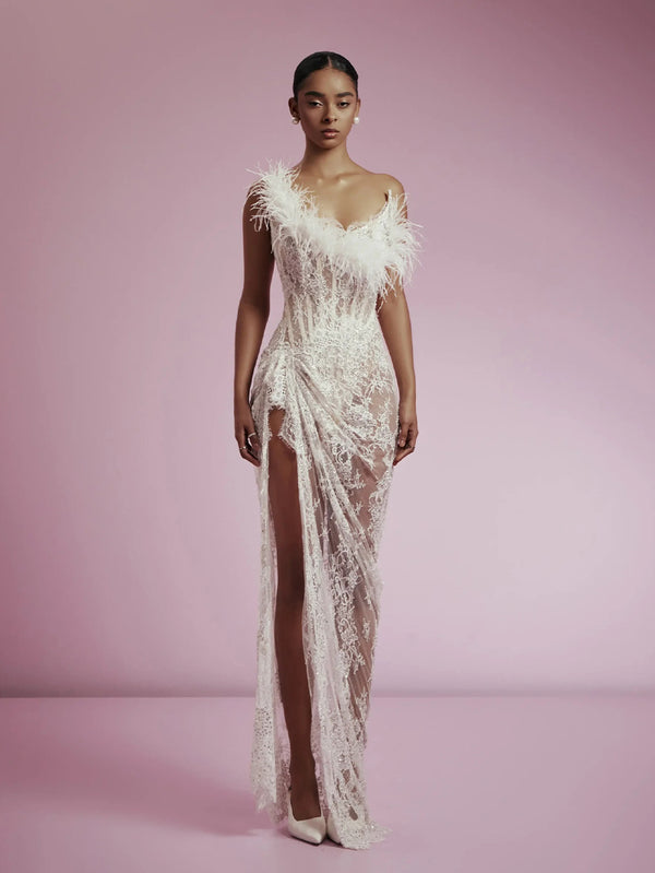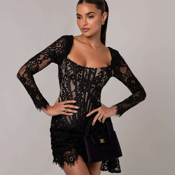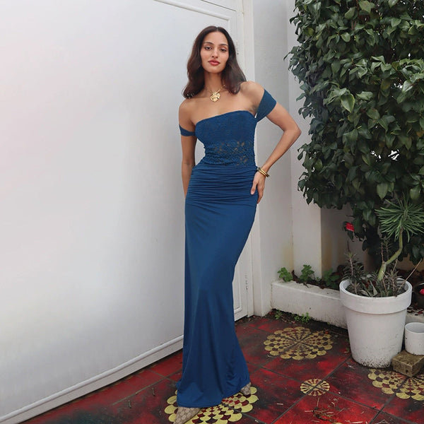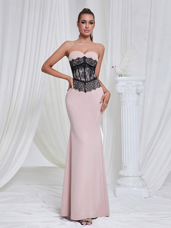 Robe mi-longue en dentelle et satin à bretelles et à boucles