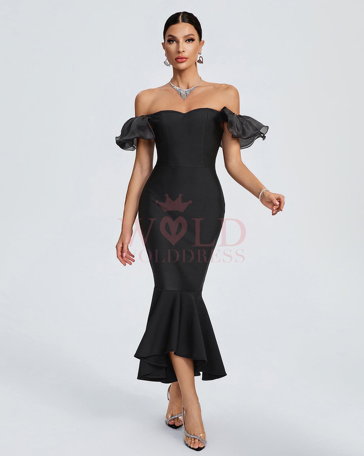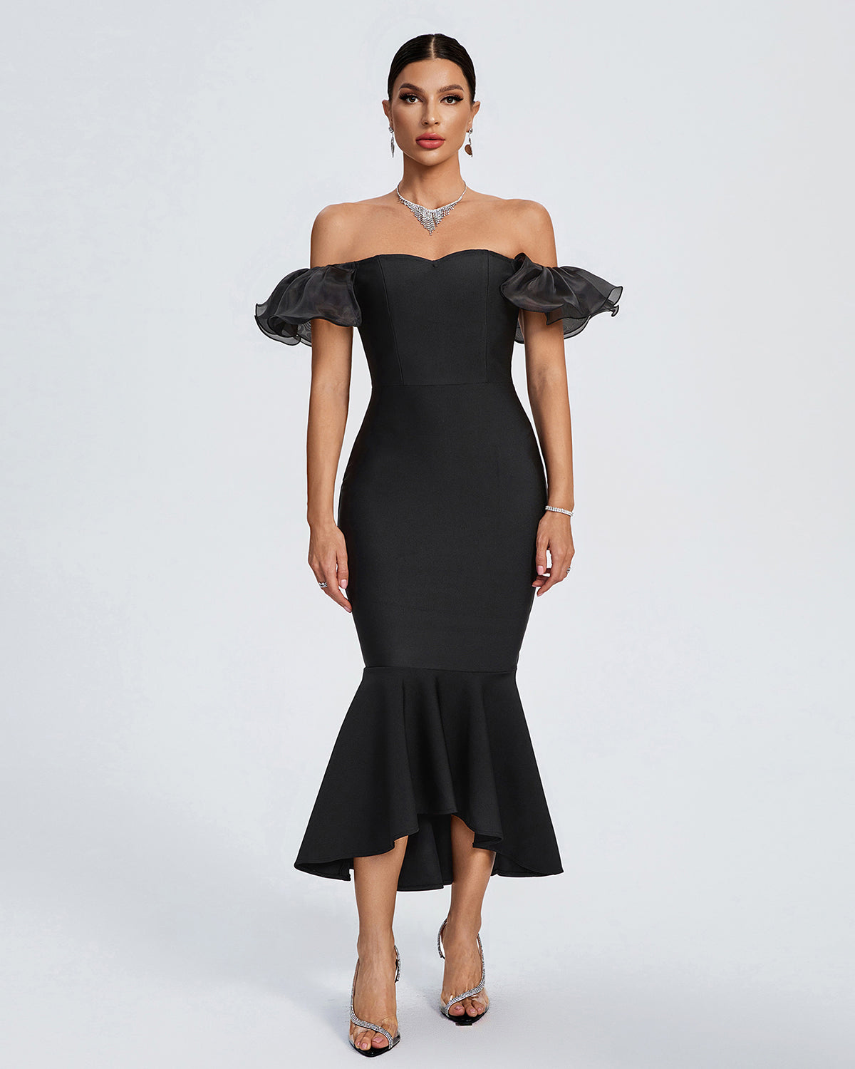 Indulge in luxury with our Off Shoulder Fishtail Bandage Dress. This sophisticated dress boasts a sleek off-shoulder design and a stunning fishtail silhouette. The black color and sleeve details add an extra touch of elegance. Elevate your evening with this exclusive and tasteful piece.