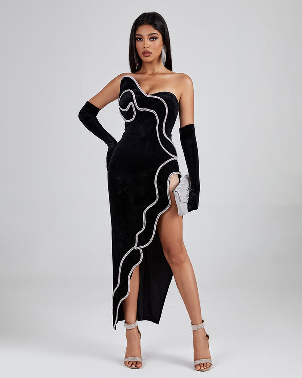 Golden Butterfly Ornamented Maxi Dress With Gloves