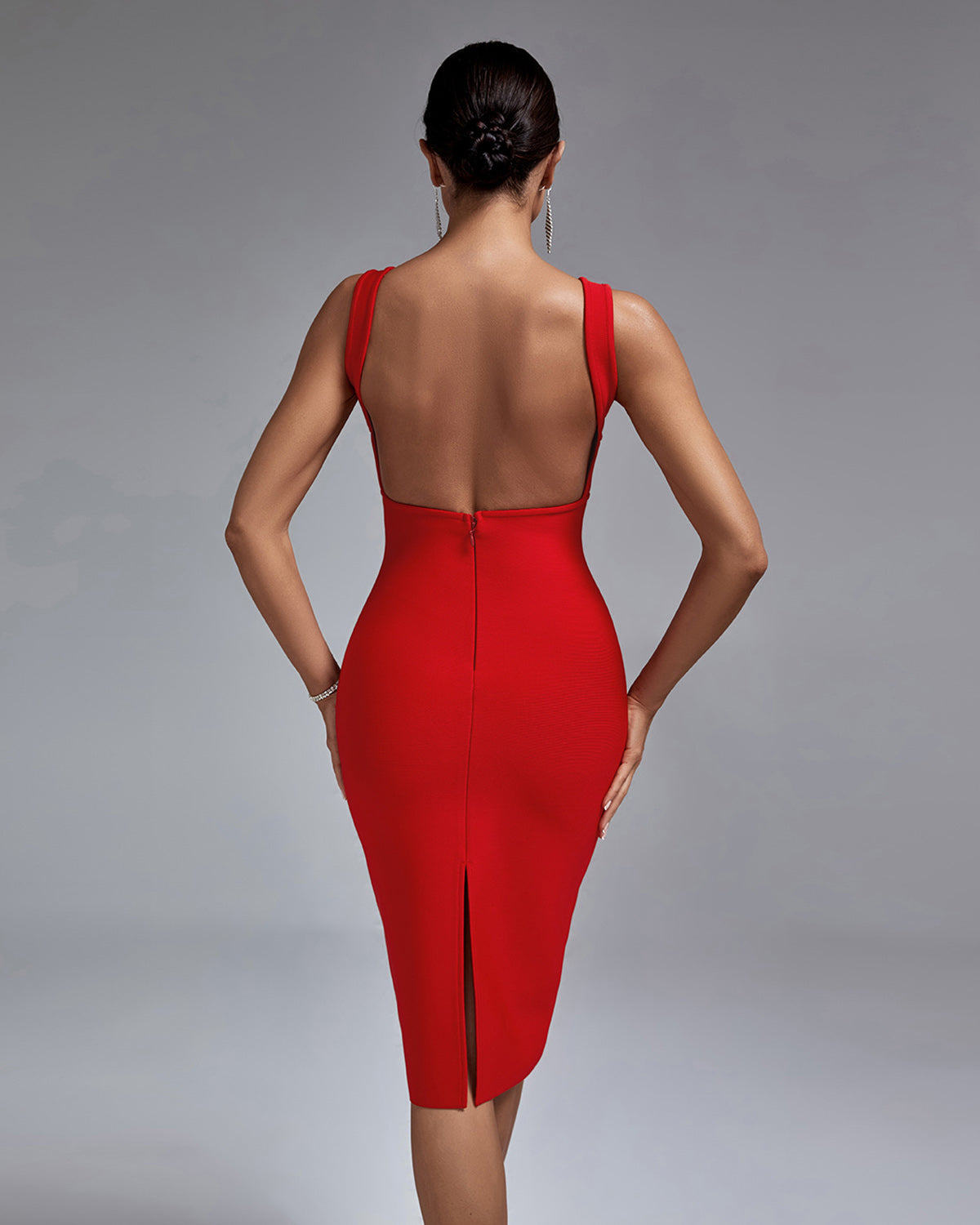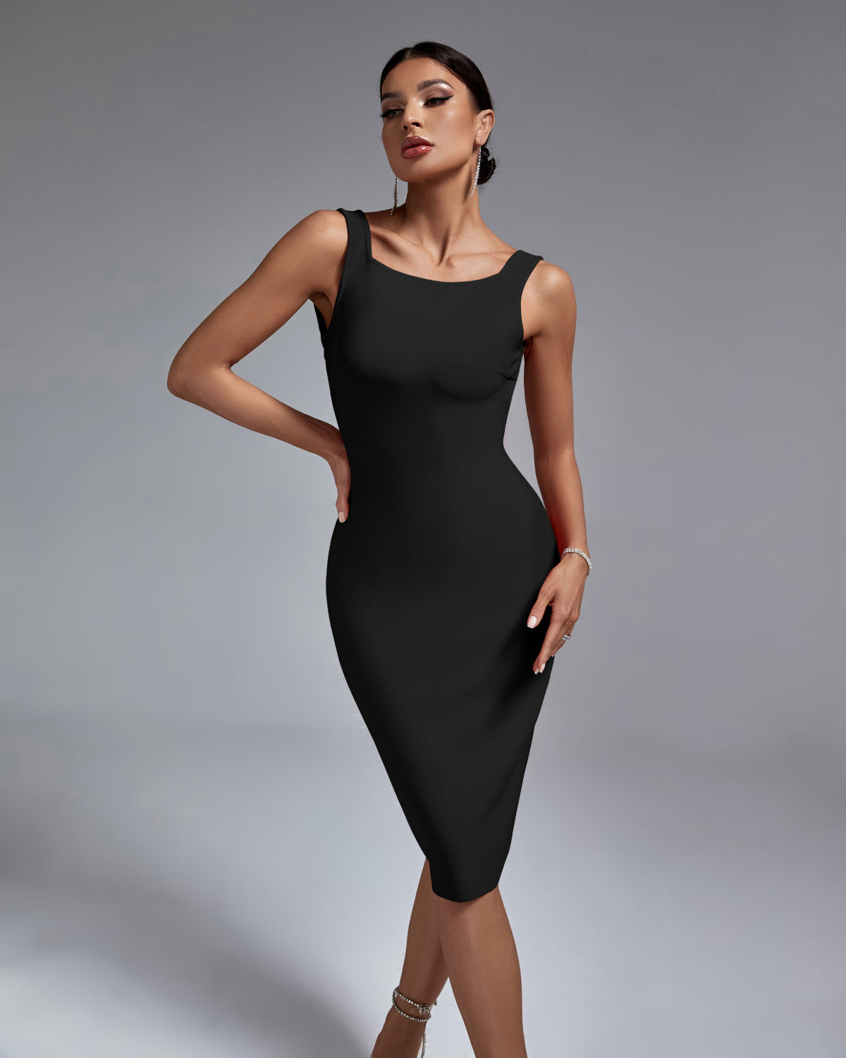 Cette belle robe midi présente un design intemporel sans dos et sans manches construit avec un tissu bandage respirant. Le matériau extensible crée une silhouette flatteuse et un ajustement parfait pour toutes les occasions.