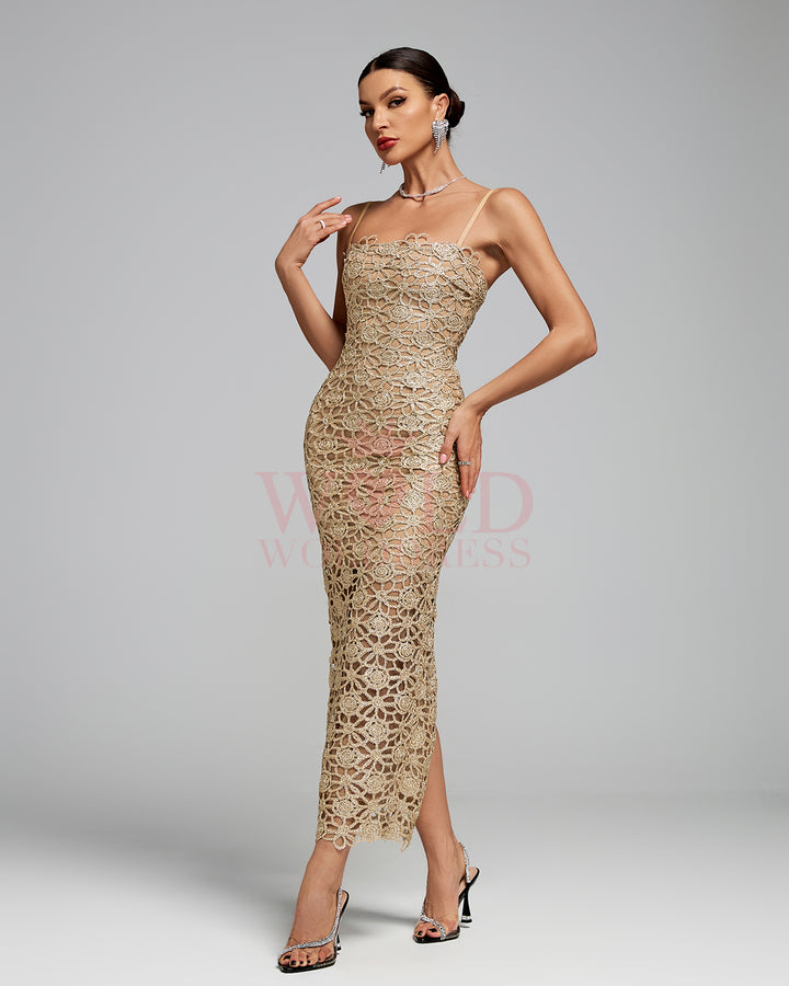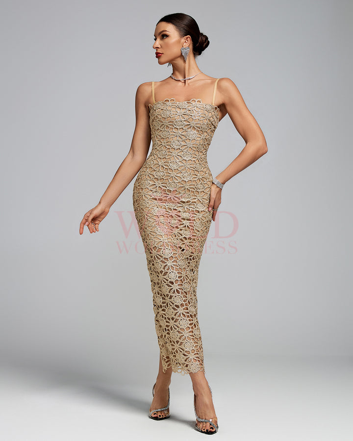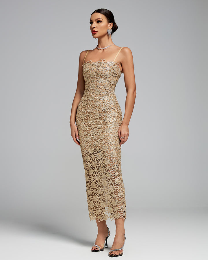 Floral-Embroidered Strap Midi Dress
