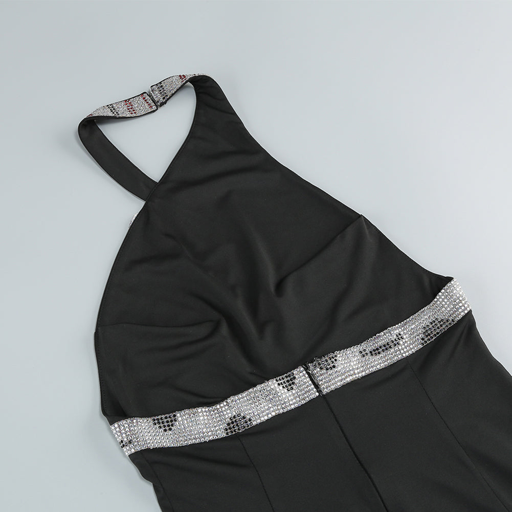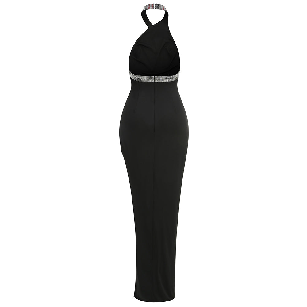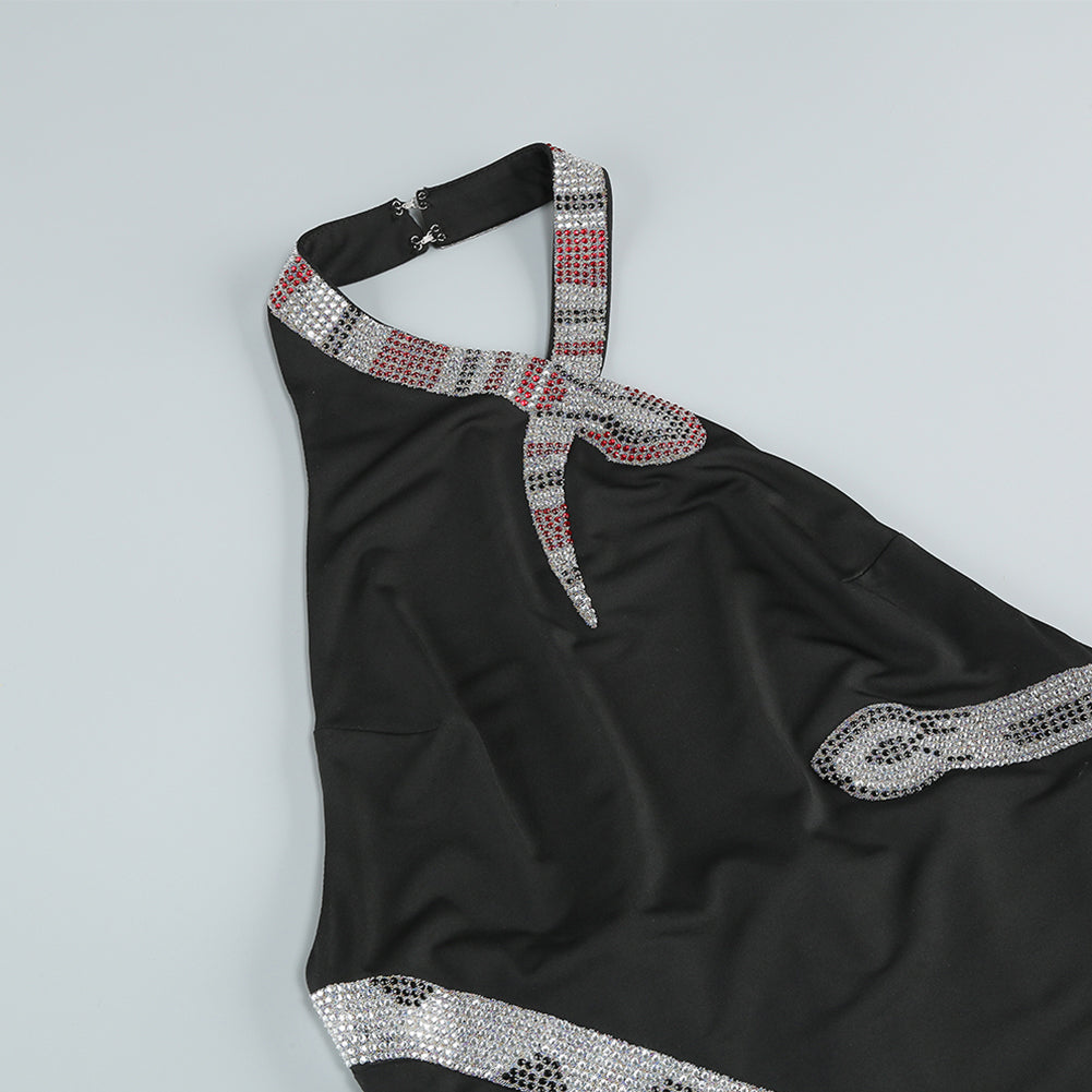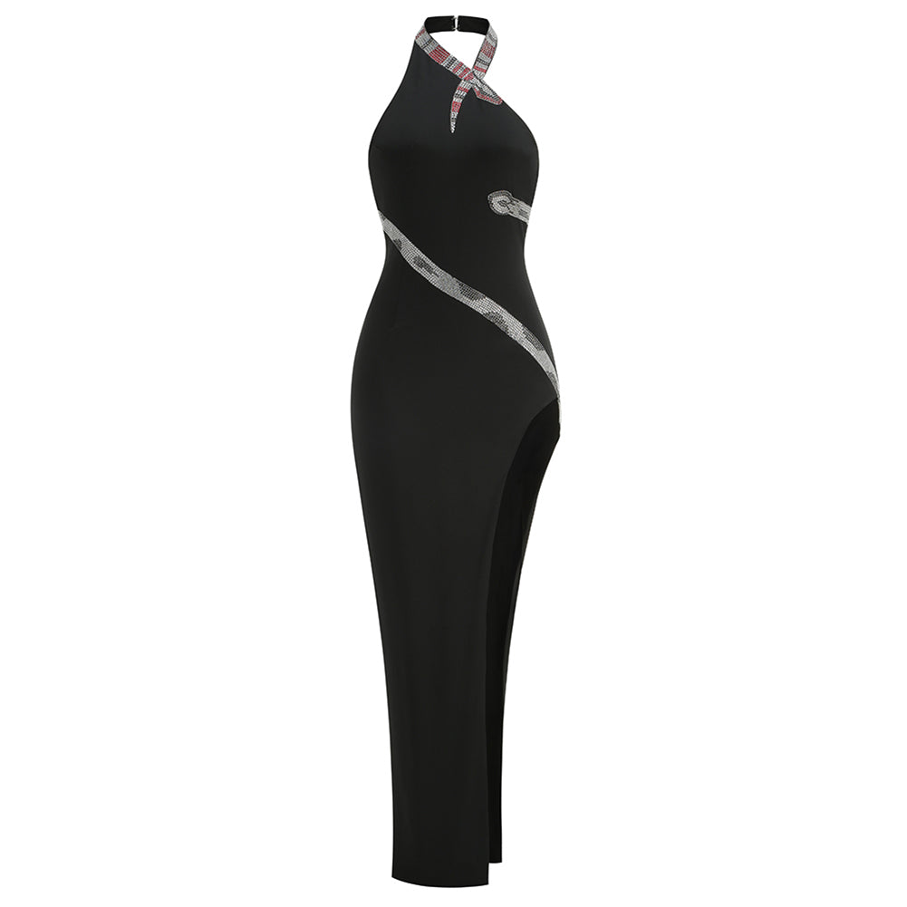 Introducing our stunning black maxi dress, designed to catch attention with its snakelike halter style. Adorned with intricate rhinestone beading, this dress exudes luxury and exclusivity. Elevate your wardrobe with this sophisticated and elegant piece, perfect for any occasion.