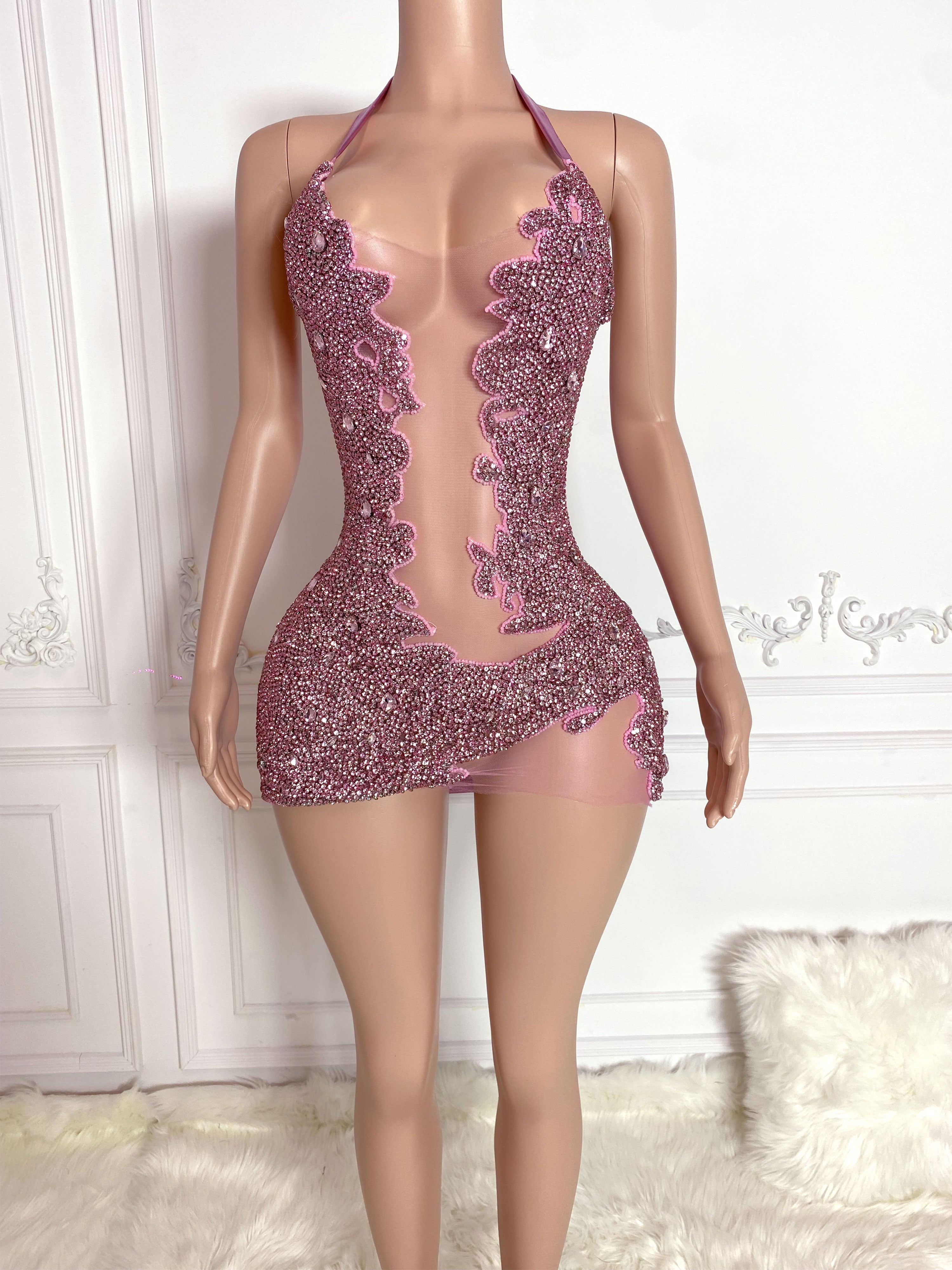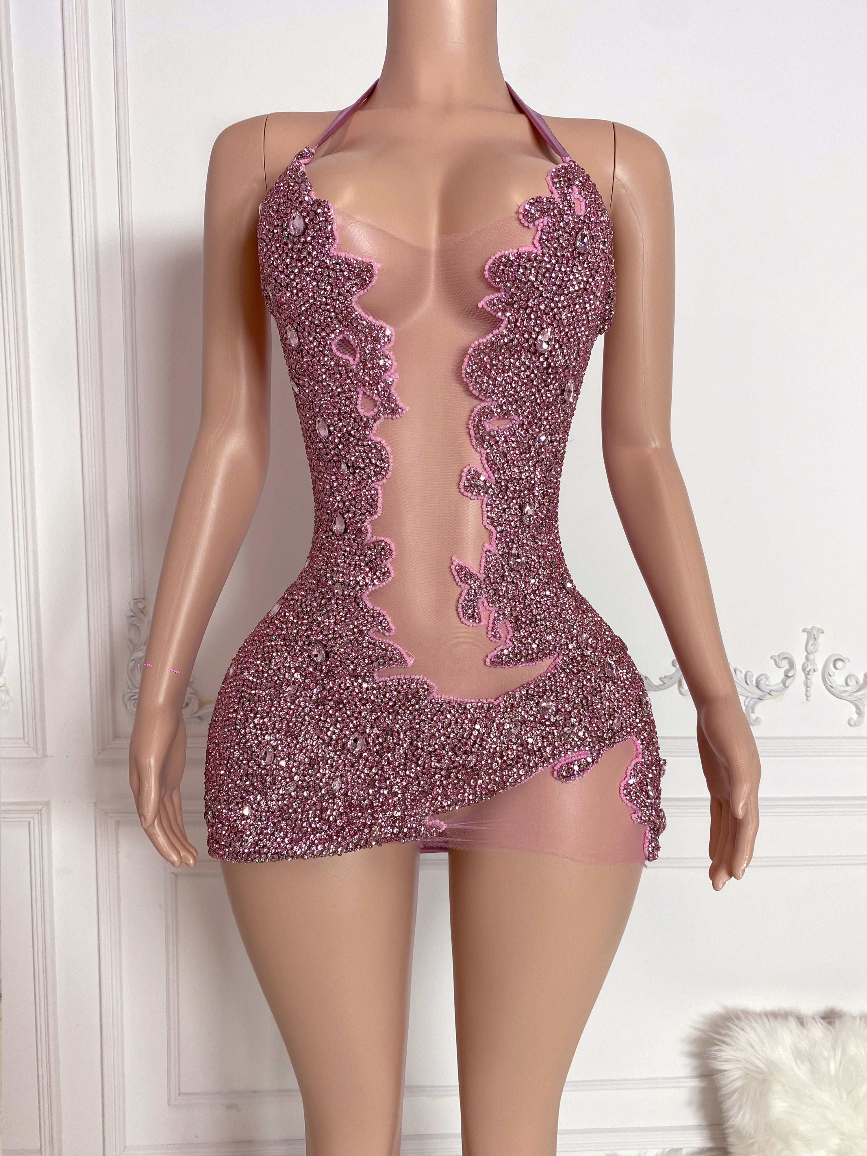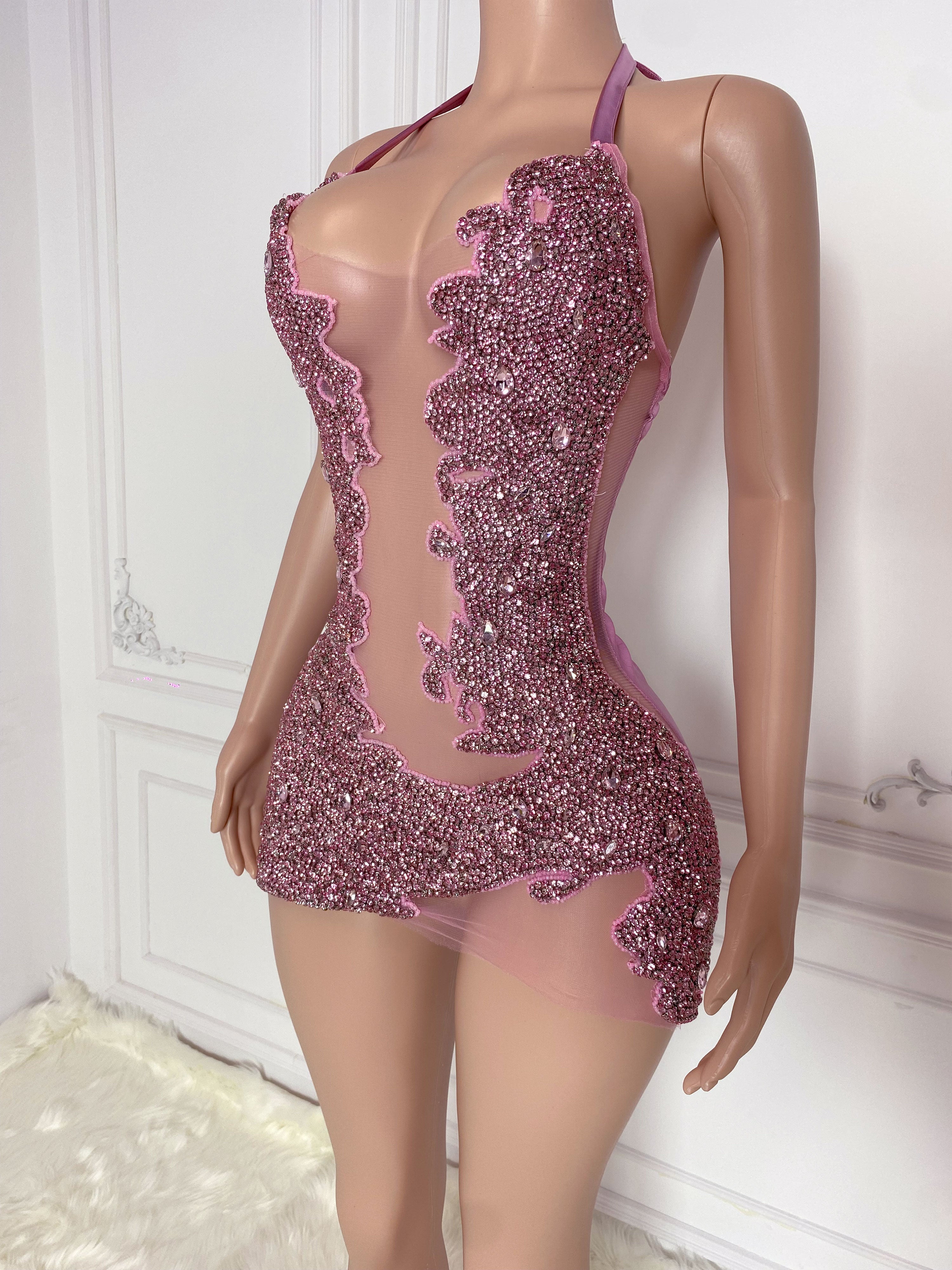 Hot Pink Hollow Out and Backless Halter Mini Dress