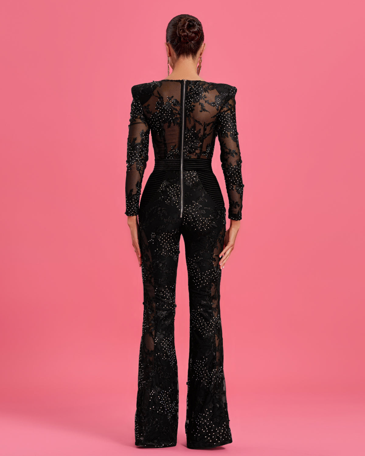 Lace Floral Bead-Embellished V-neck Jumpsuit