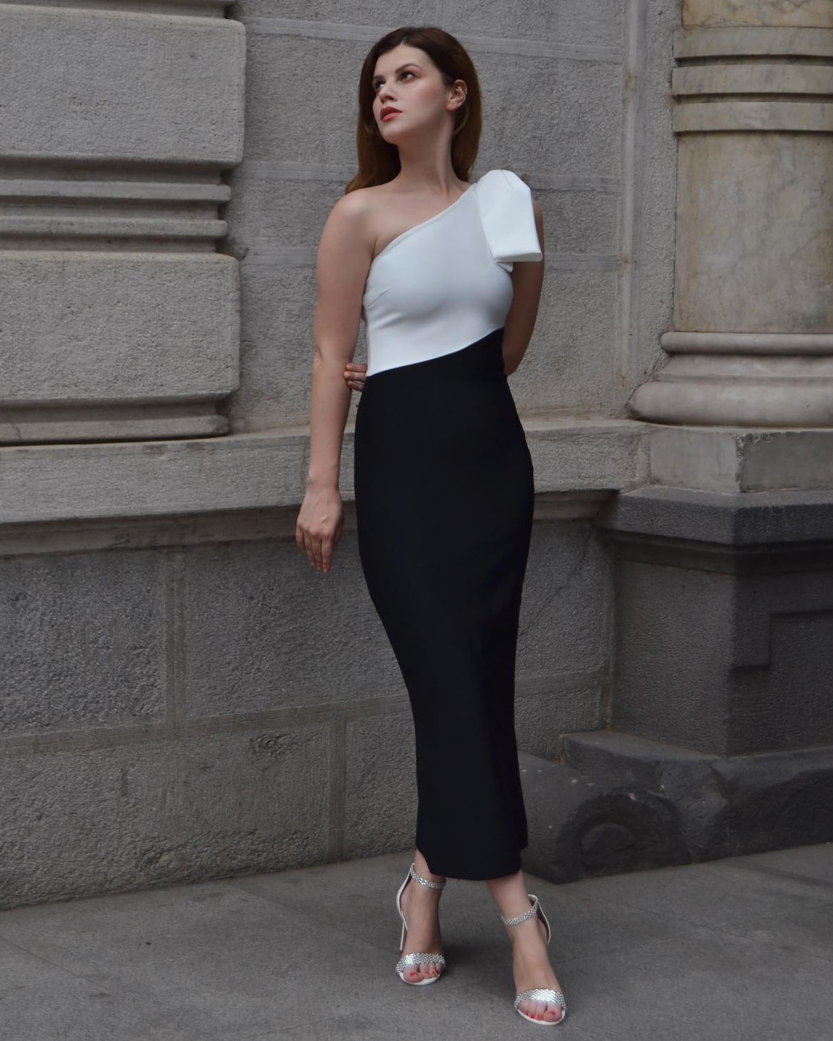 Multi Color One Shoulder Midi Bandage Dress