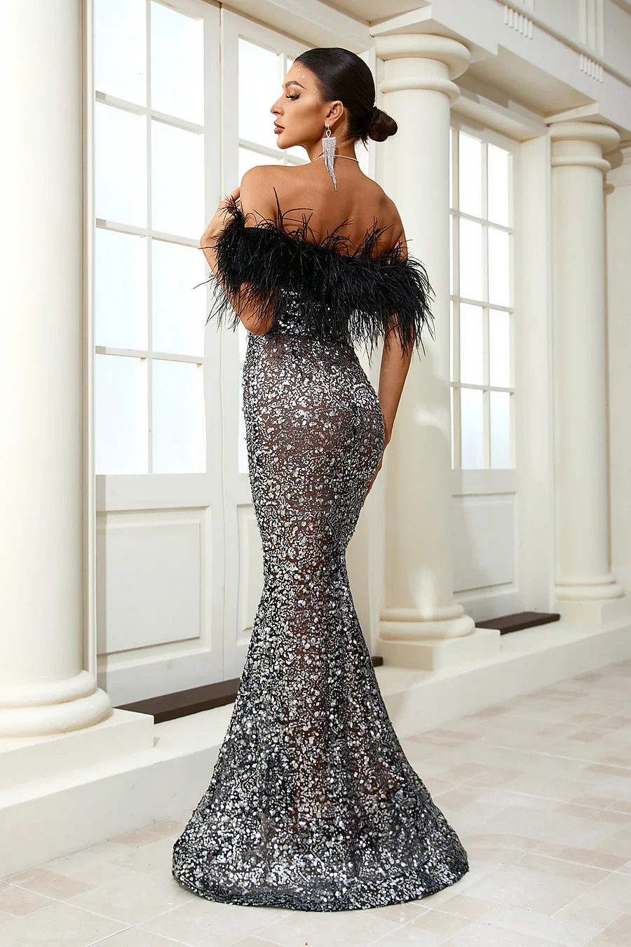 Off Shoulder Feather Maxi Mermaid Dress HT1148