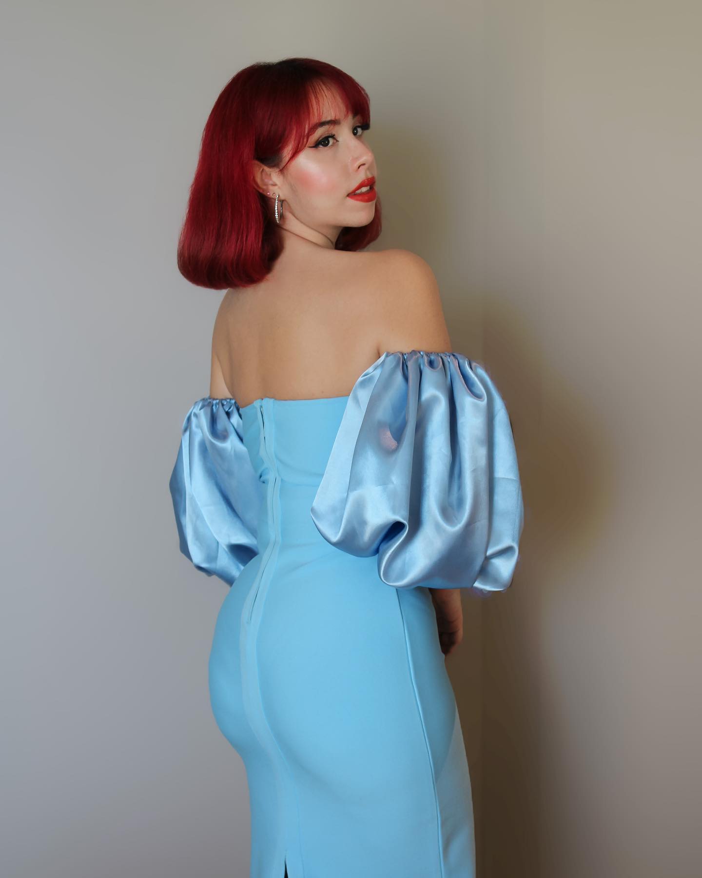 Robe bandage mi-longue à volants et manches bouffantes à épaules dénudées