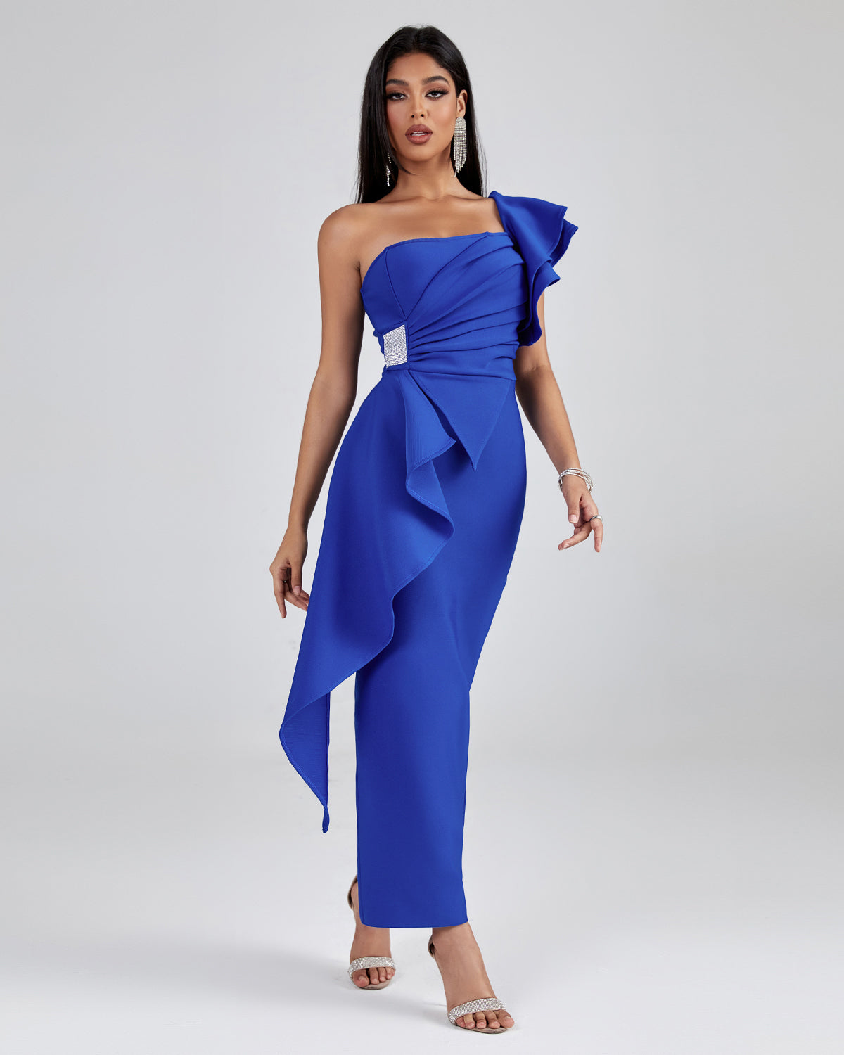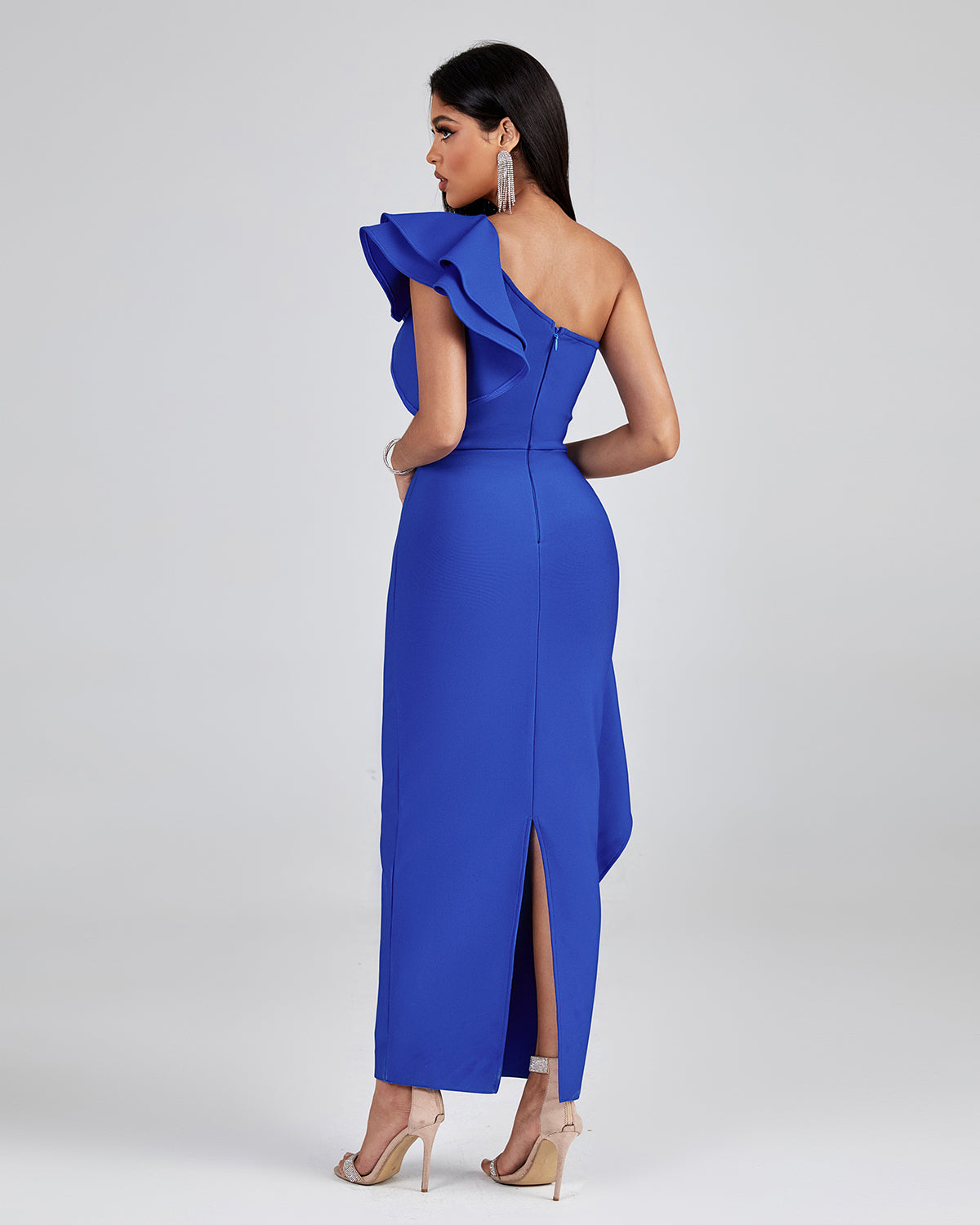 Upgrade your wardrobe with this One Shoulder Ruffle Bandage Long Dress. Made with high-quality materials, this dress features a unique and elegant one shoulder design with ruffle details. Perfect for special occasions or a night out, this dress will make you stand out and feel confident. Get yours now!