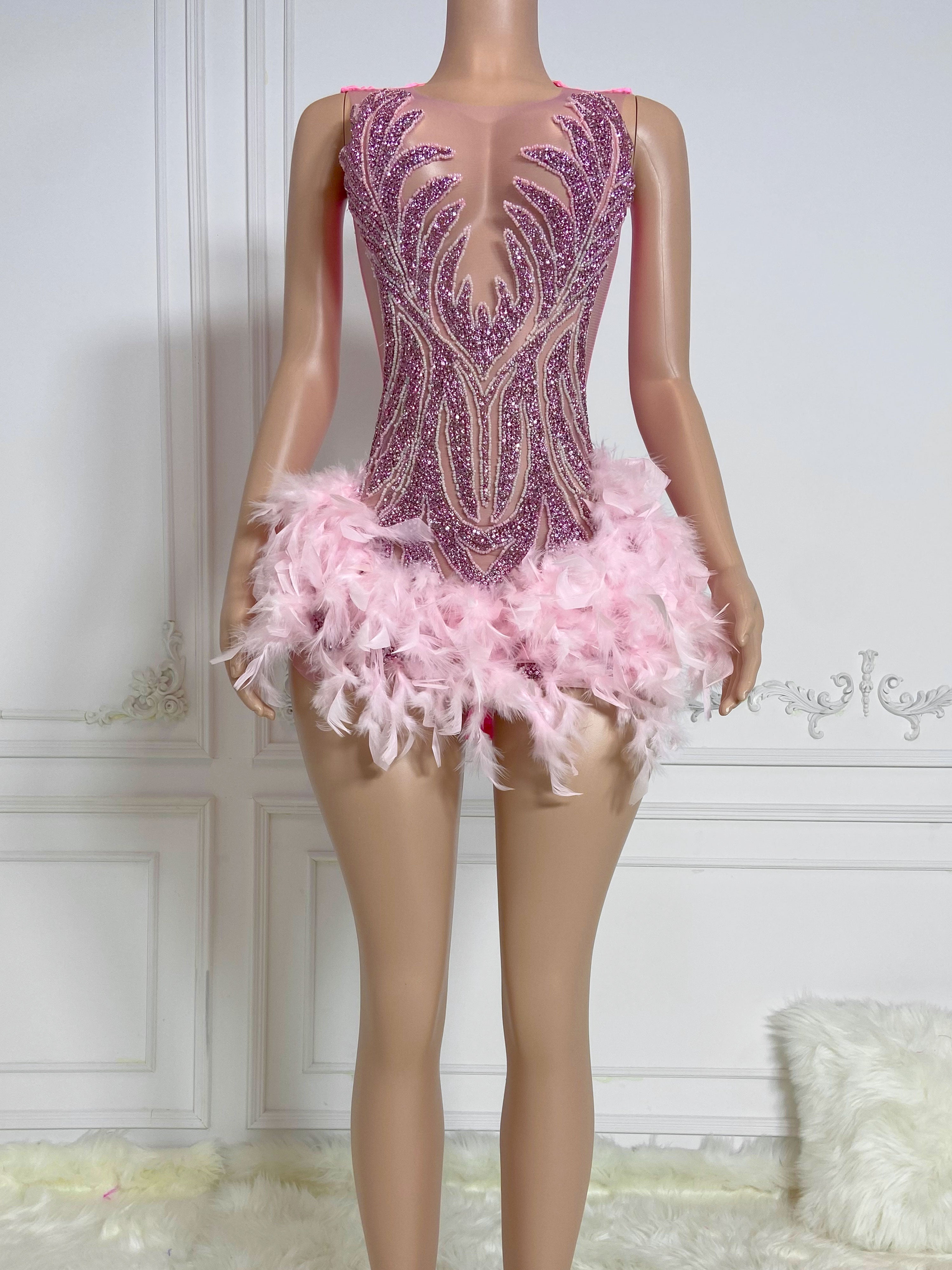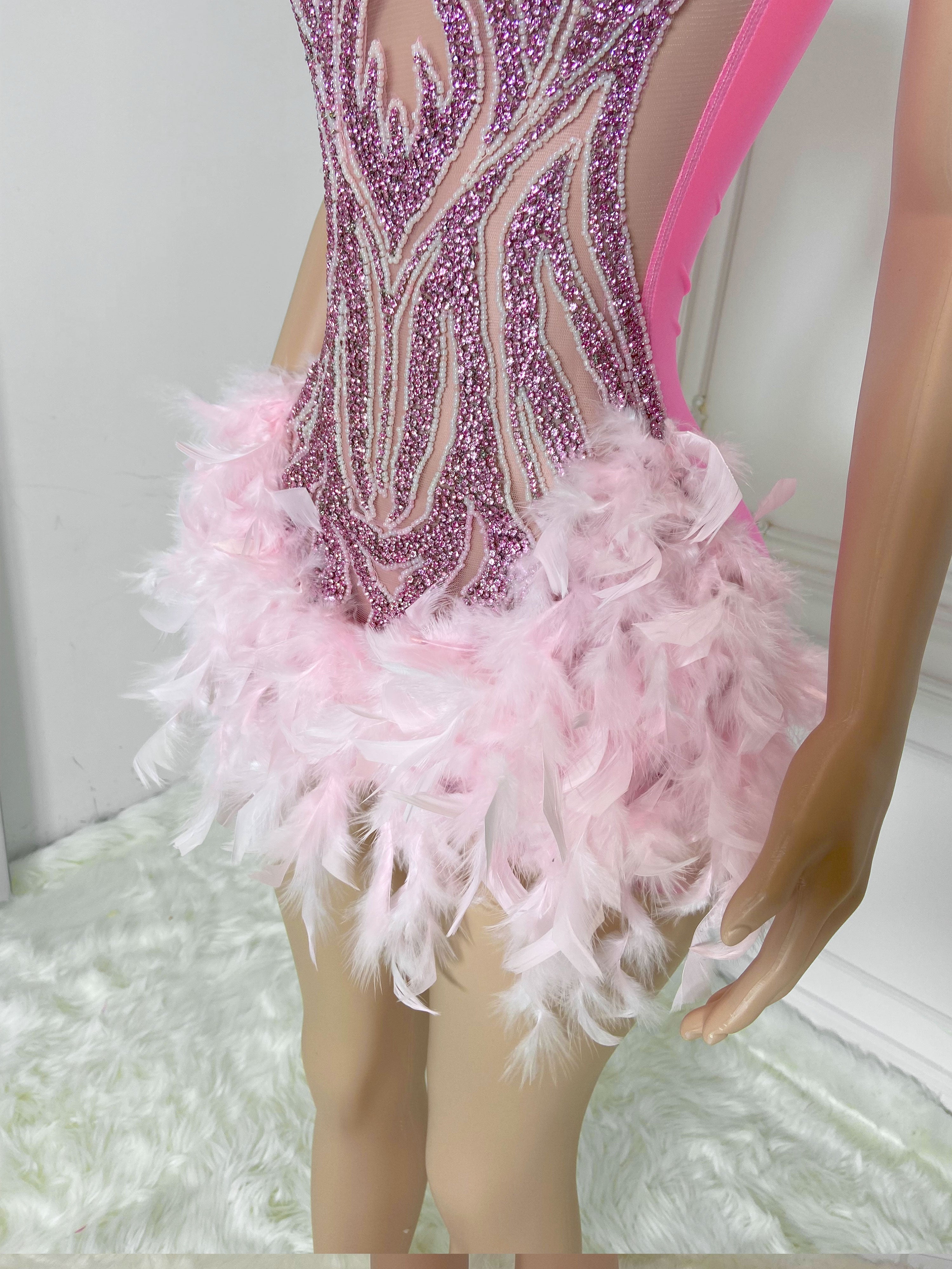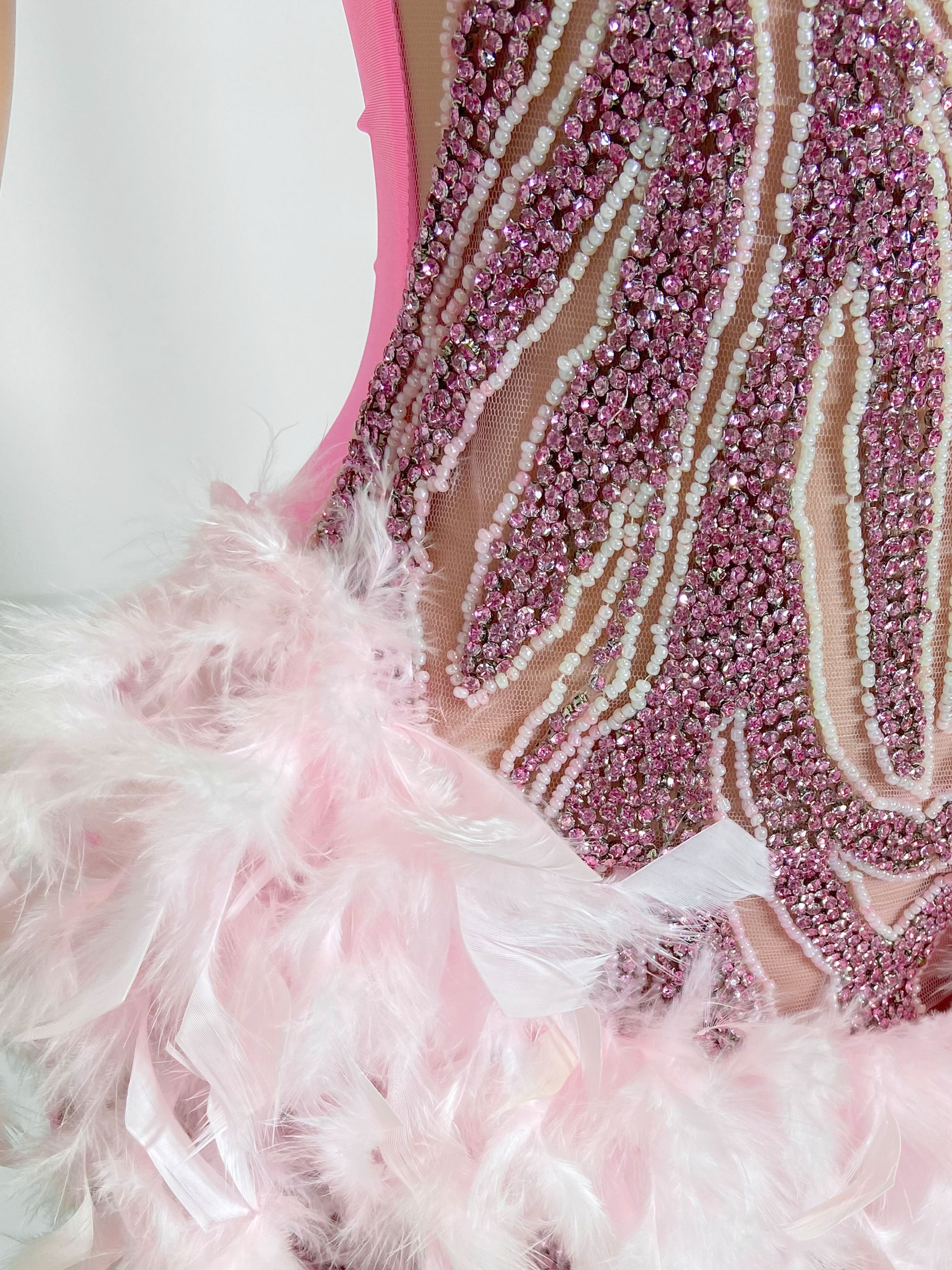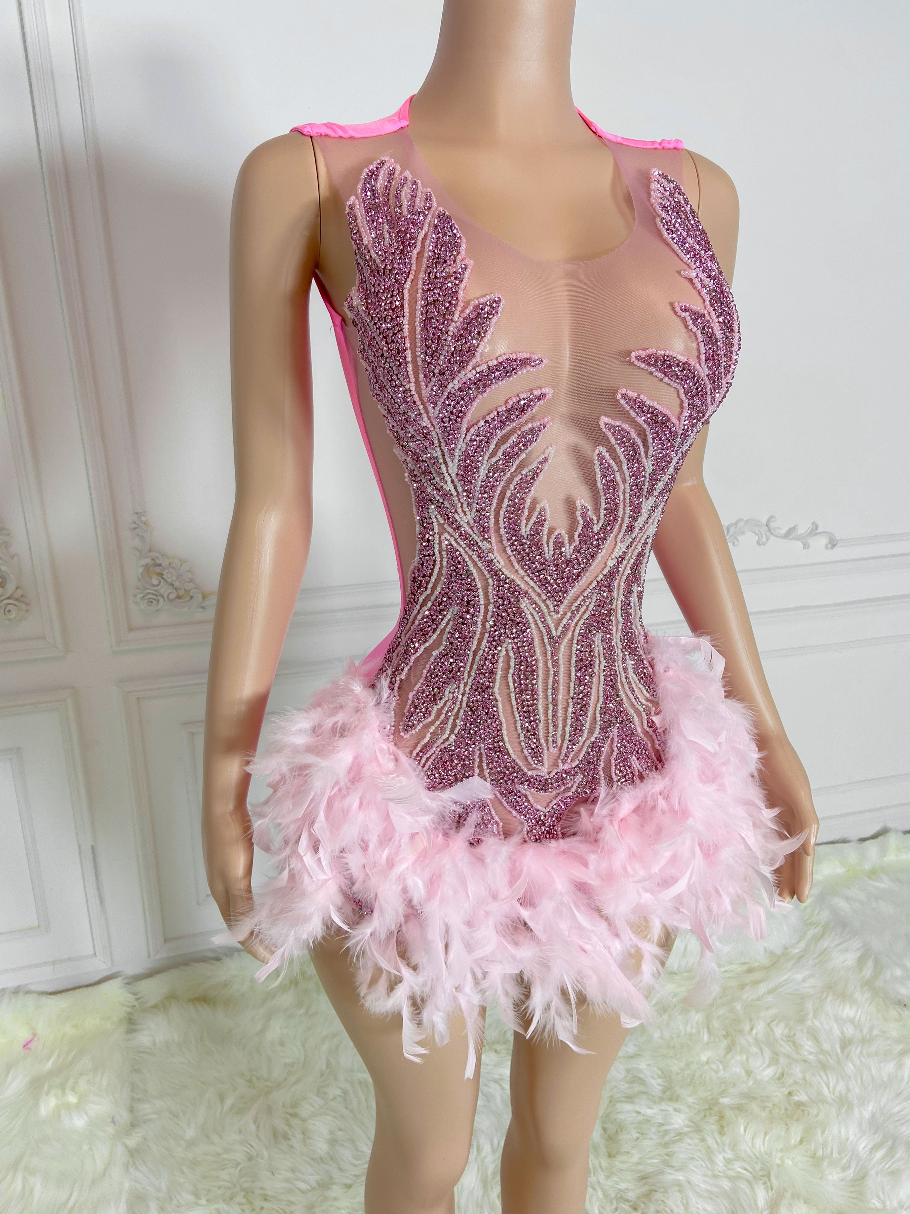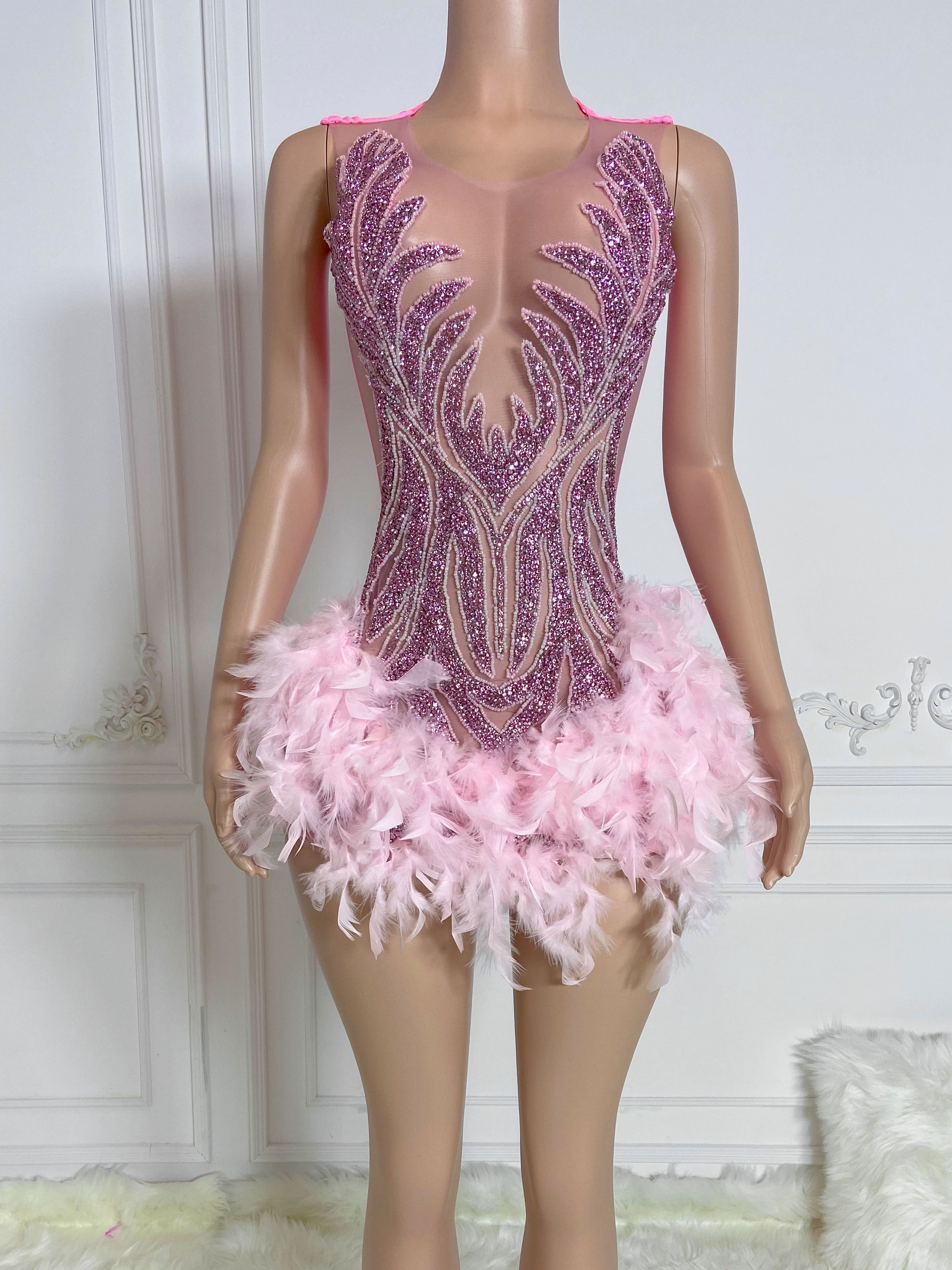 Pink Round Neck Sleeveless with Feather Mini Dress