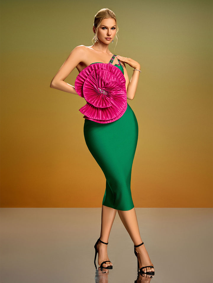 Pleated Flower Crystal Bandage Midi Dress