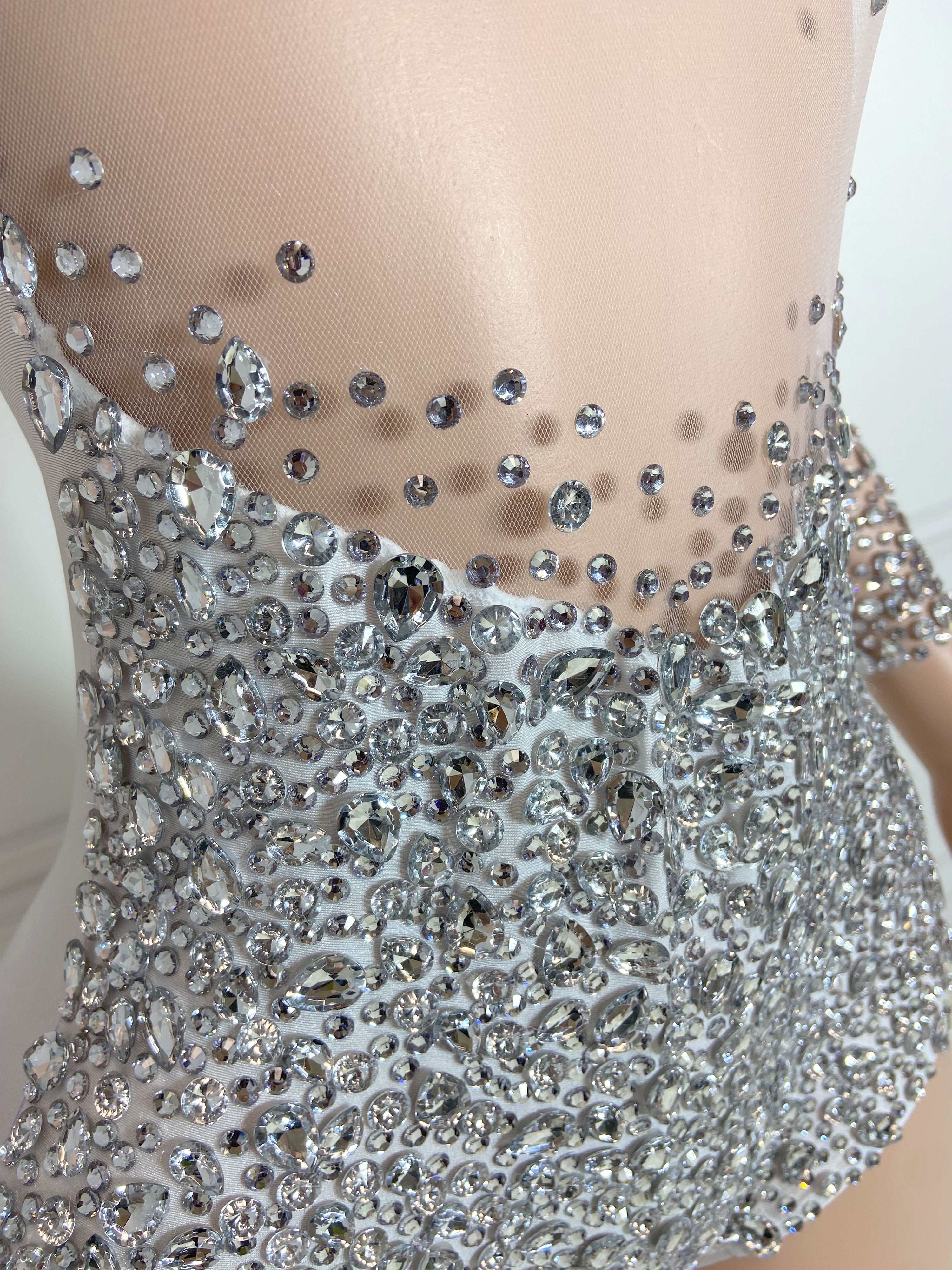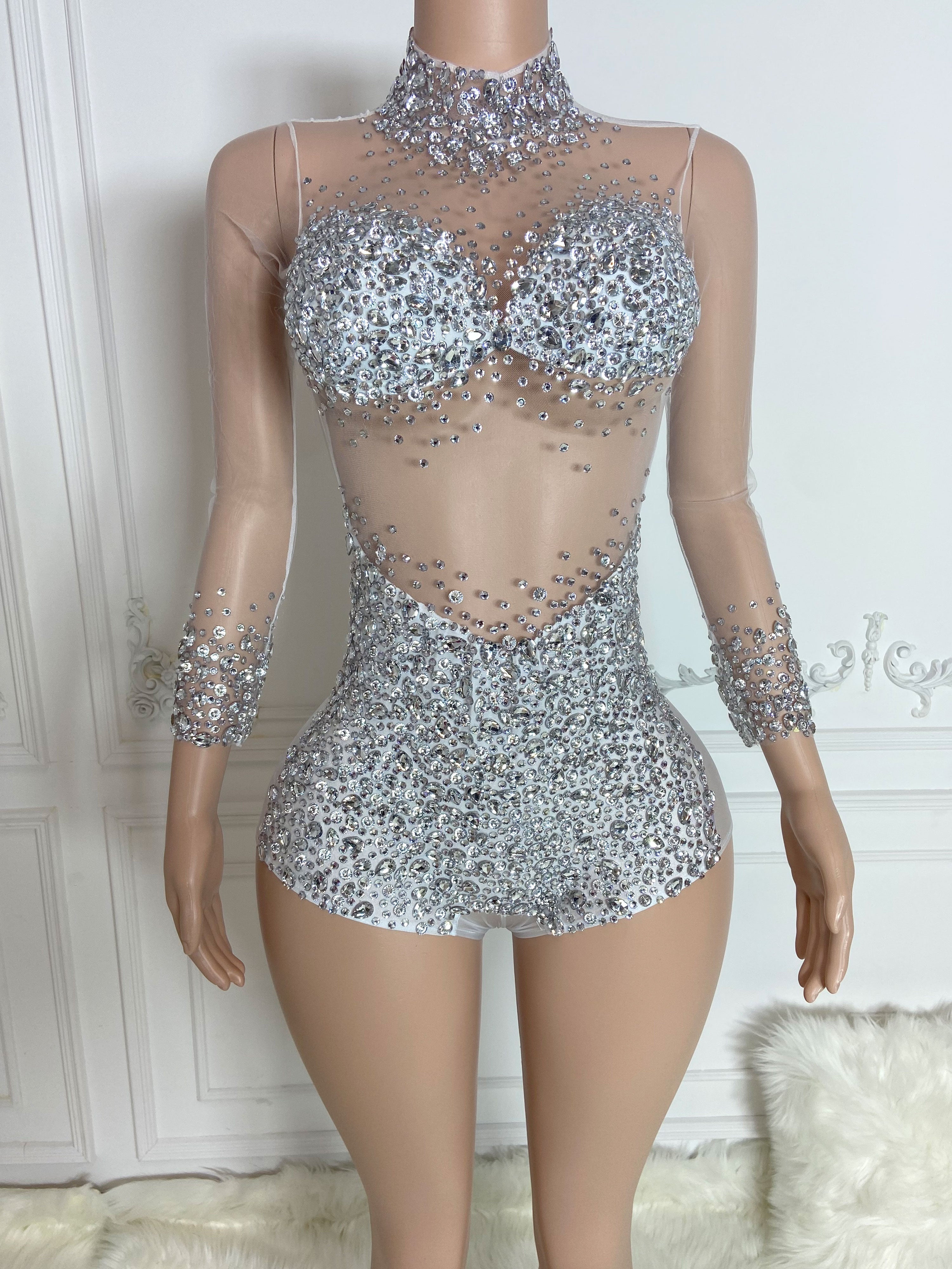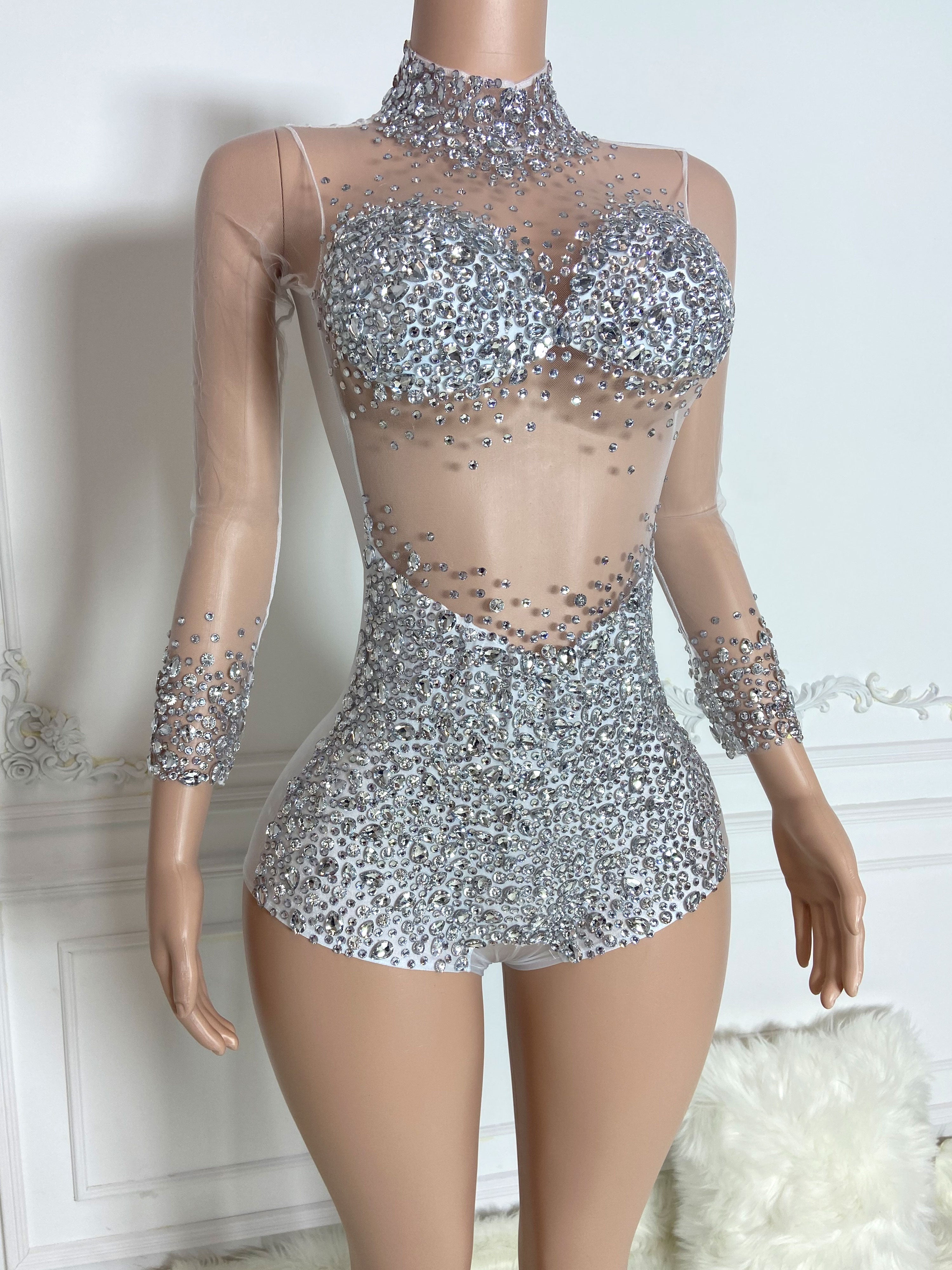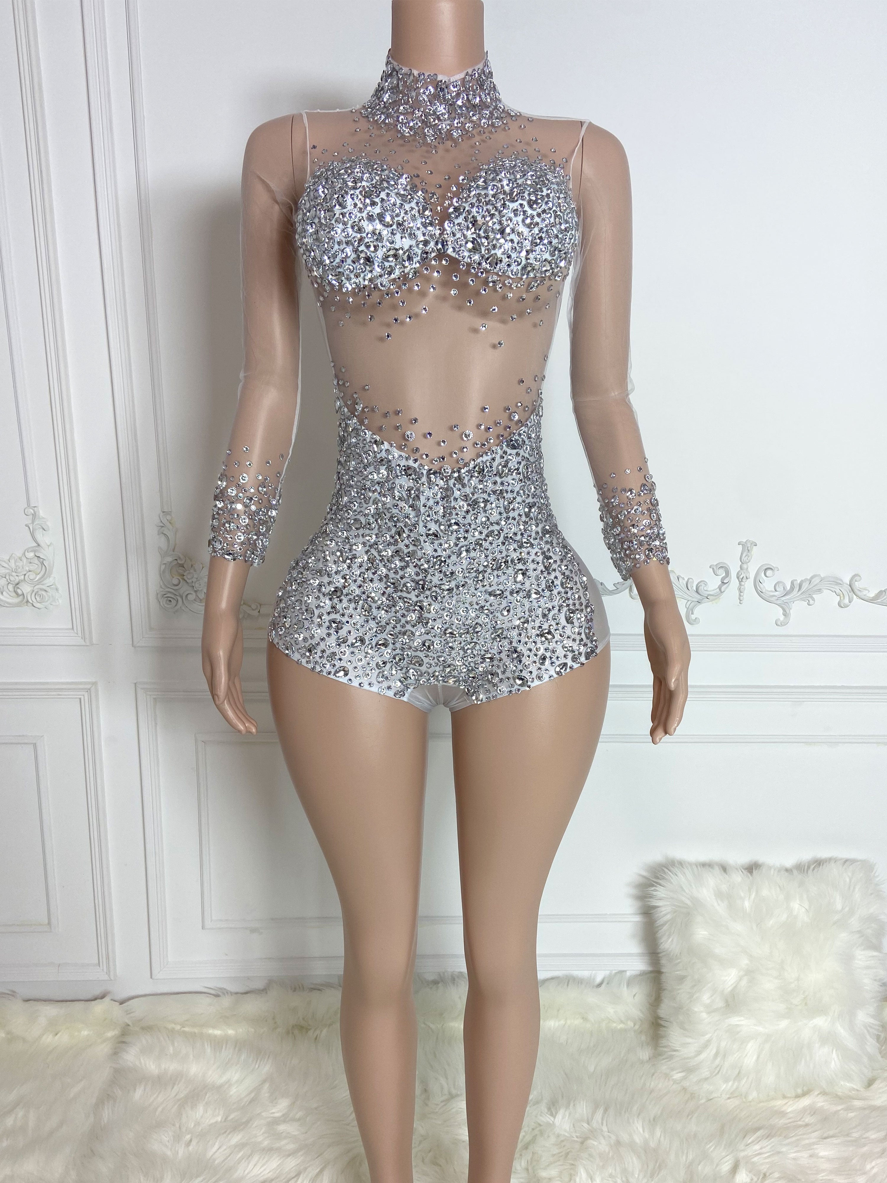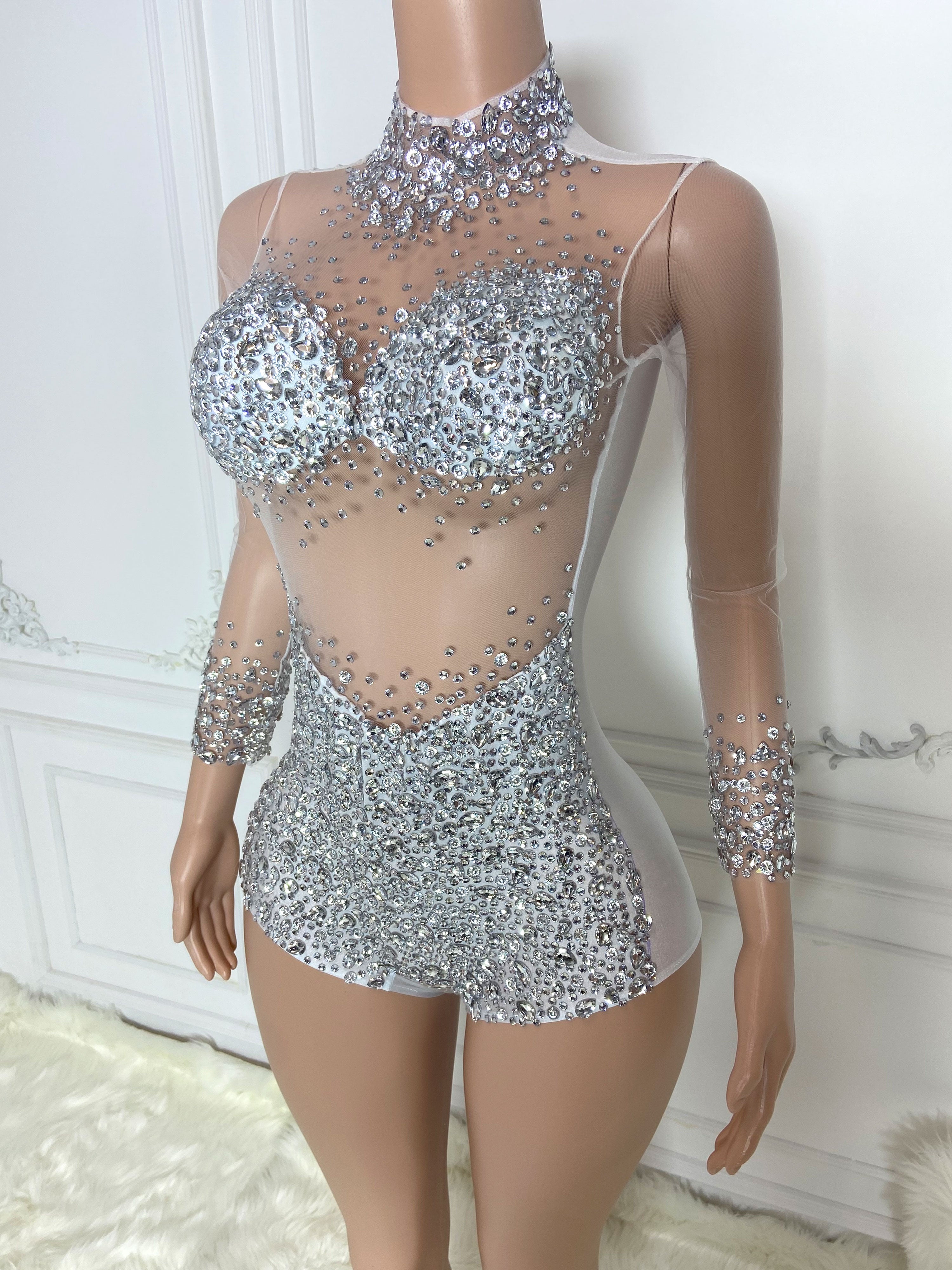 Silver High Collar Long Sleeve Rhinestone Jumpsuit