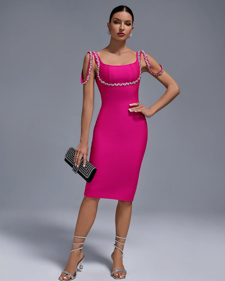 Step out in style with our Square Neck Rhinestone Midi Bandage Dress. Made with high quality materials, this dress features a flattering square neckline and sparkling rhinestone details that elevate any look. Perfect for any occasion, this dress is a must-have addition to your wardrobe.
