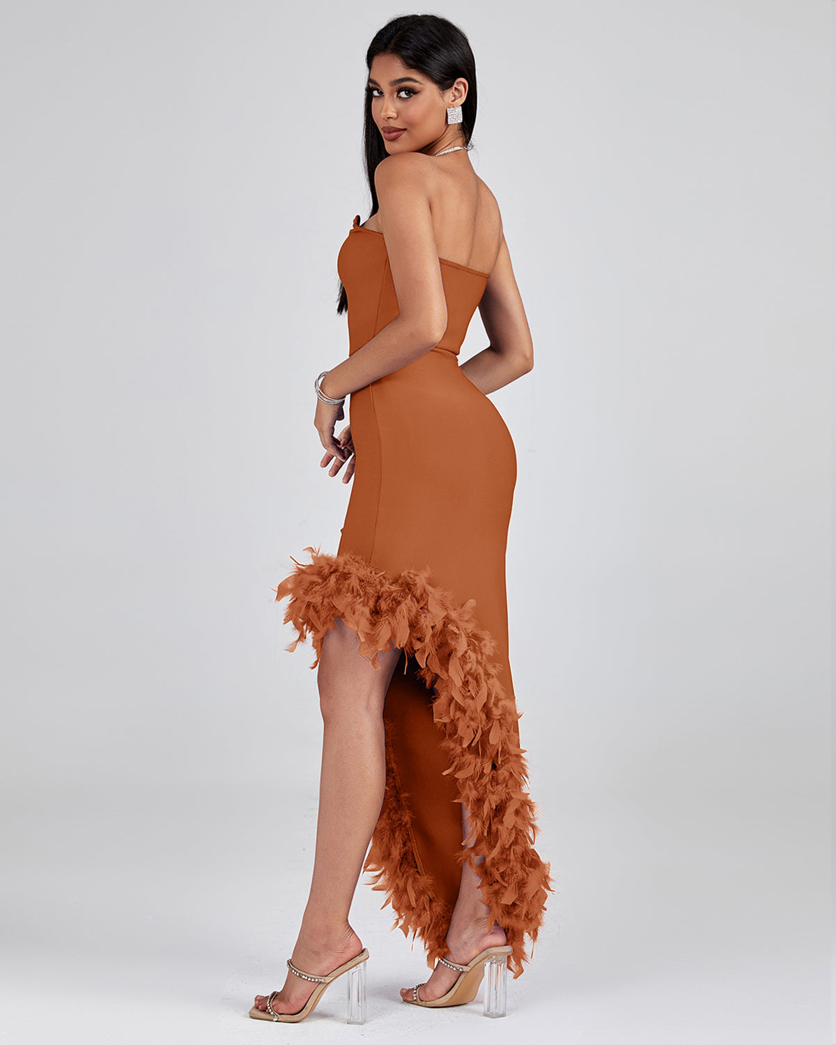 Add a touch of glamour to your wardrobe with our Strapless Feather Trim Bandage Long Dress! The strapless design allows for a flattering silhouette, while the feather trim adds a playful and unique element to this elegant dress. Perfect for any formal event, this dress is sure to make a statement and turn heads.