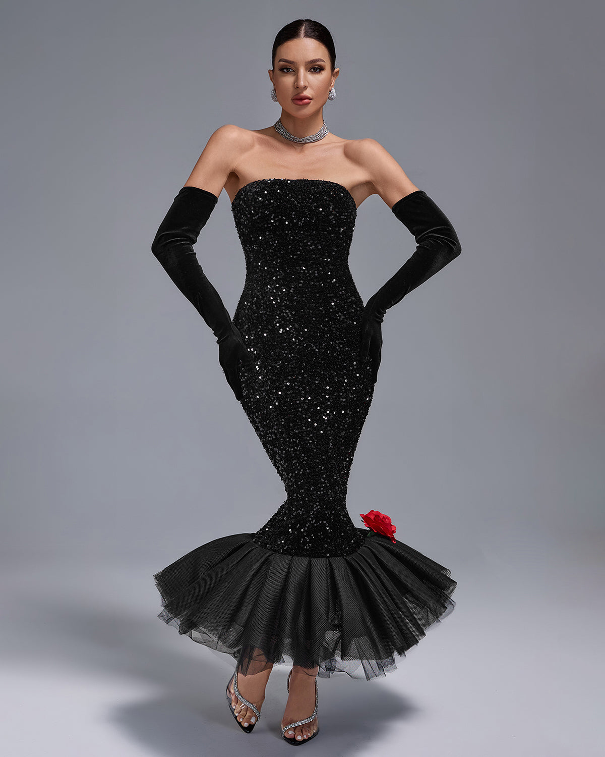 Dazzle in our Strapless Sequins Barbie Wiggle Dress with Gloves! This stunning dress features a strapless design and sparkling sequins, perfect for any special occasion. The included gloves add a touch of elegance and glamour. Make a statement and turn heads wherever you go!