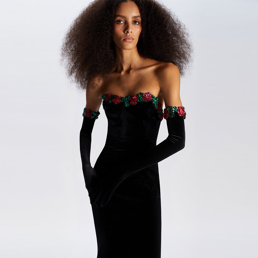 Enhance your elegance and grace with our Strapless Sleeveless Sequins Midi Dress. The strapless design and sleeveless cut create a sleek and sophisticated silhouette while the alluring sequins add a touch of glamour. Perfect for any special occasion, this dress will make you stand out in the most refined and luxurious way.