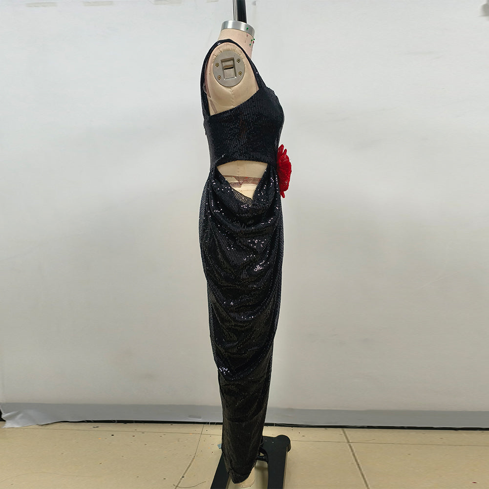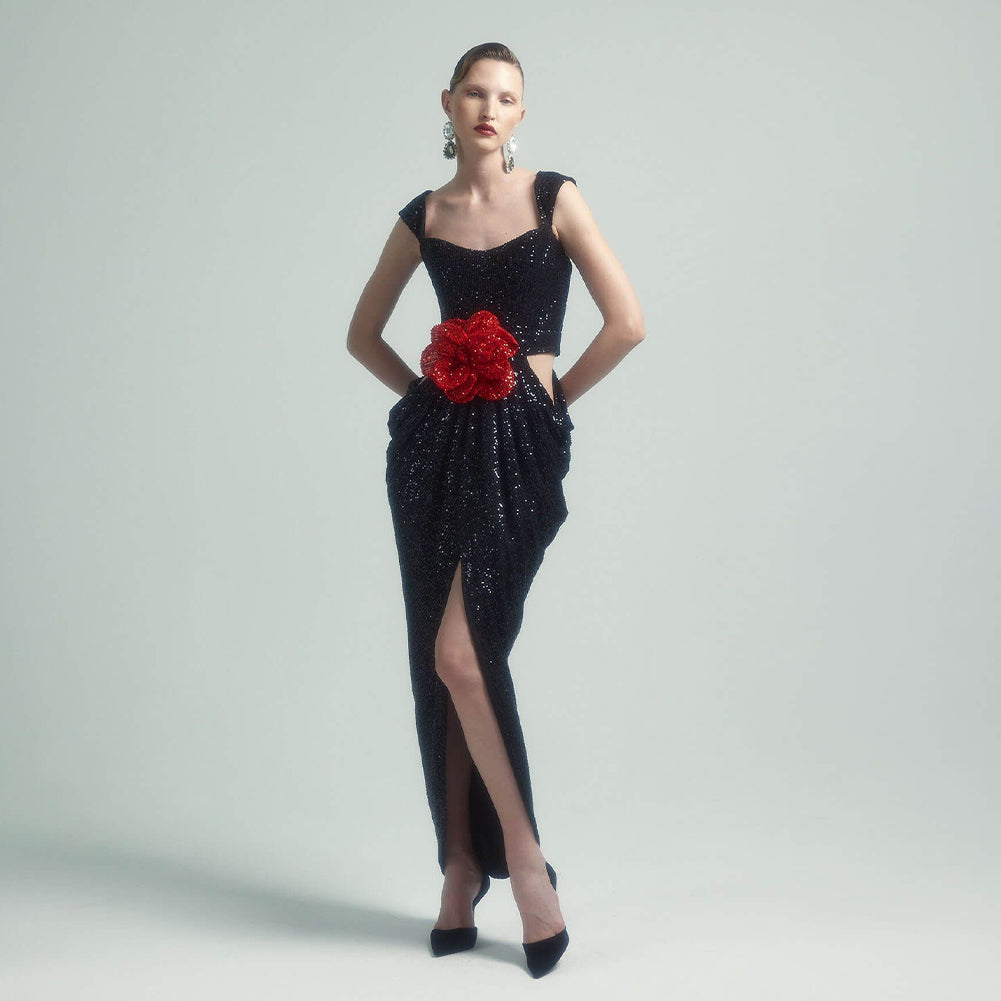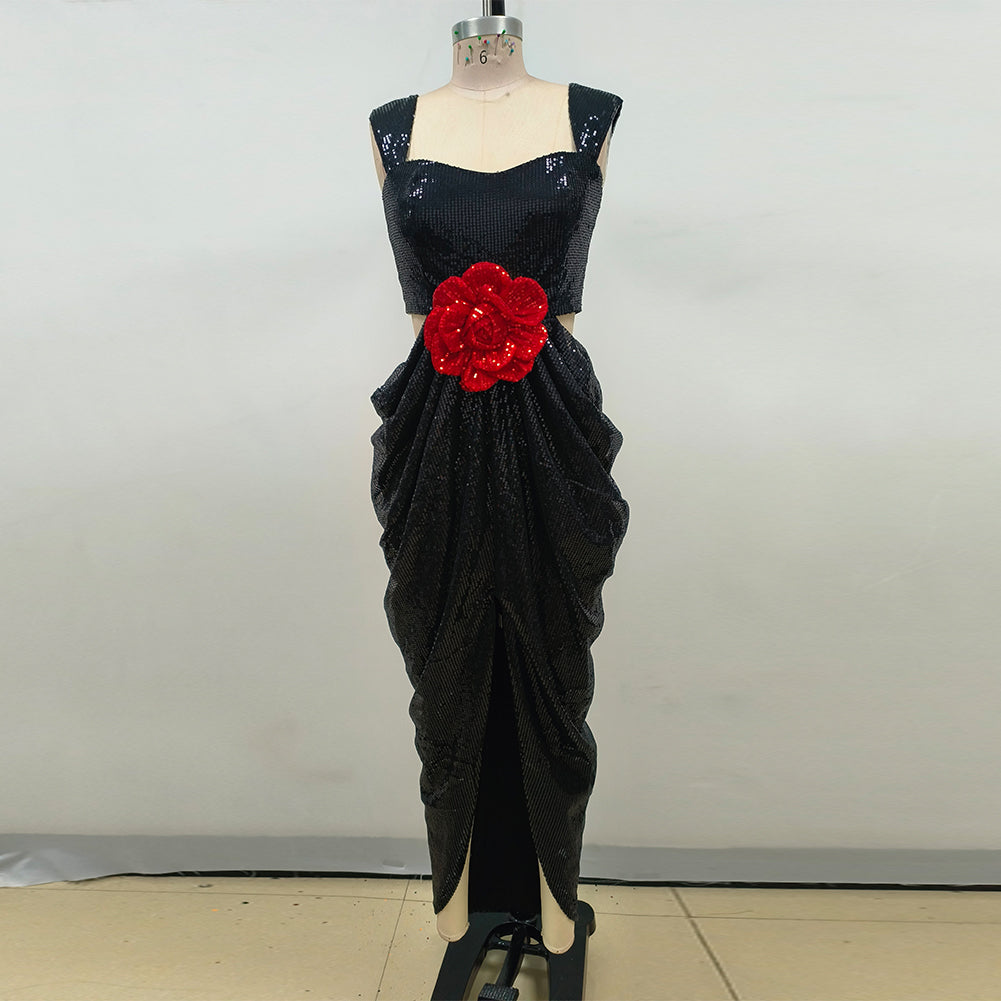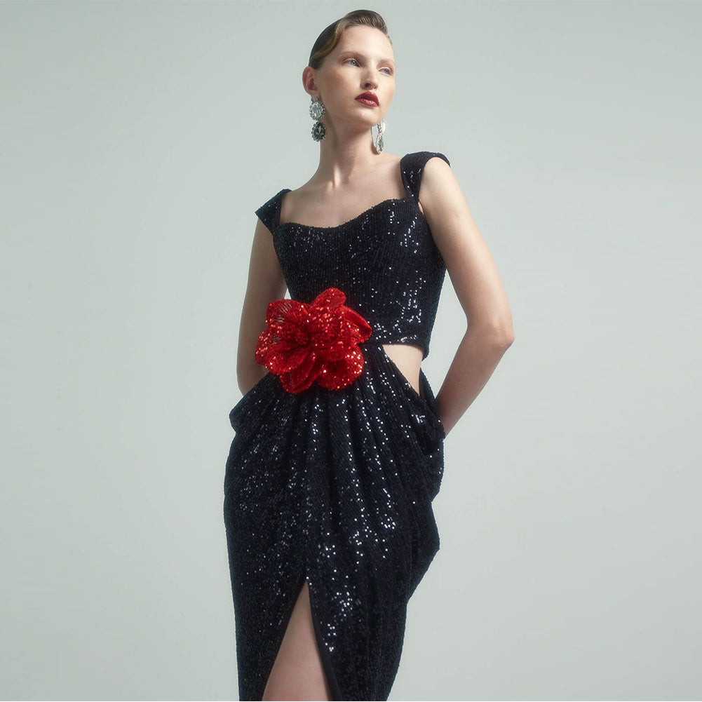 Indulge in the vintage vibe of our black and red pleated dress. Crafted from shinny sequins fabric and the detailded flower adornment, this split dress dilvers a sparkling look all night. Elevate your style with this piece.