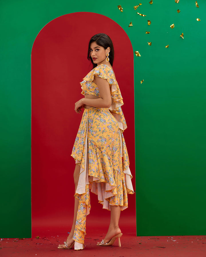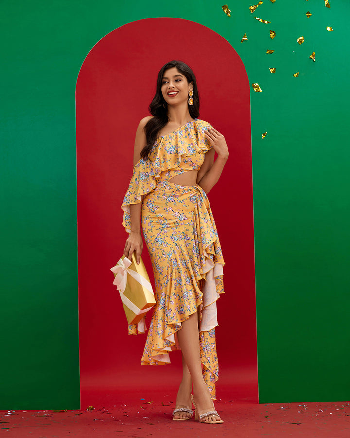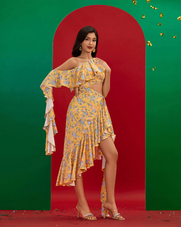 Step out in style with this stunning Asymmetric Cutout Ruffle Floral Dress. Featuring a delicate floral pattern and cutout ruffles, this dress exudes sophistication and elegance, ensuring you make a fashion statement that is sure to be remembered. Perfect for special occasions or an evening out, this dress is the epitome of luxury.
