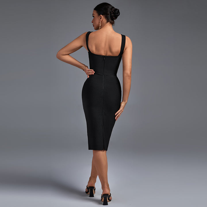 Elevate your wardrobe with this sophisticated midi bandage dress. Crafted with luxurious figure-hugging material, the dress features delicate strappy detailing, a low back, and an elegant midi length. Perfect for a chic and stylish look.