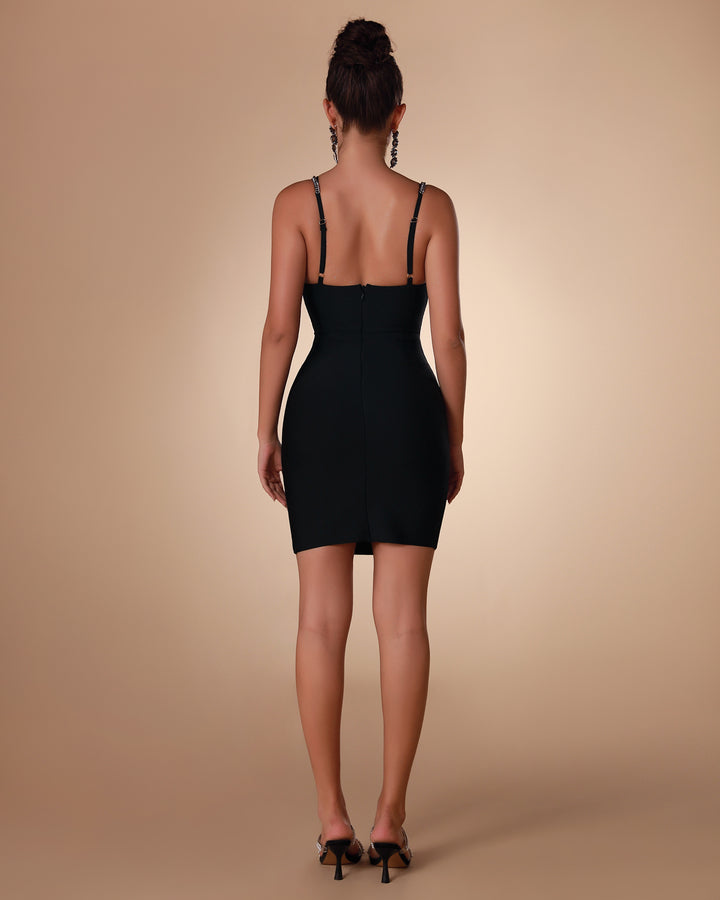 This black mini bandage dress is a fashionable wardrobe essential. Made of high quality fabric, it features a hollow crystal flower front and shoulder chains with chest studs for an updated and sophisticated look.